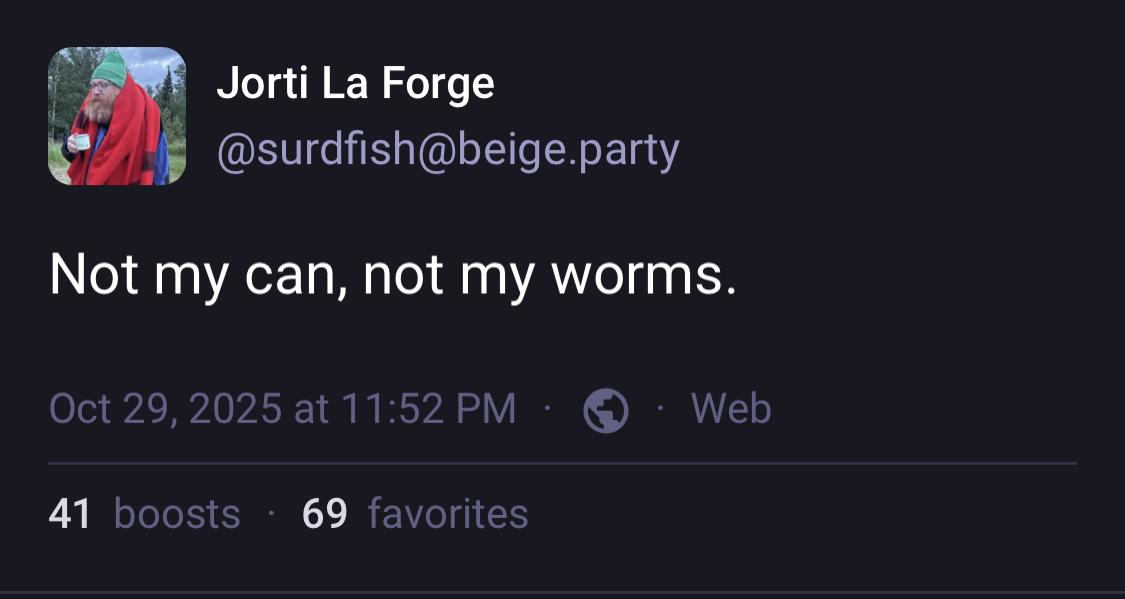 Screenshart of surdfish's very first 69er on the Mastodon YEEEEEEEEE: "Not my can, not my worms." 41 boosts • 69 favourites https://beige.party/@surdfish/115461556250423510