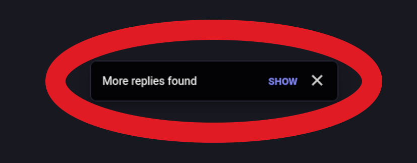Screenshot of the "More replies found" dialogue box from Mastodon, which appears when Mastodon has detected more replies to a thread you're currently viewing. Click on "Show" to make those new replies appear. This allows everyone on all servers to see the same view of a discussion thread.
