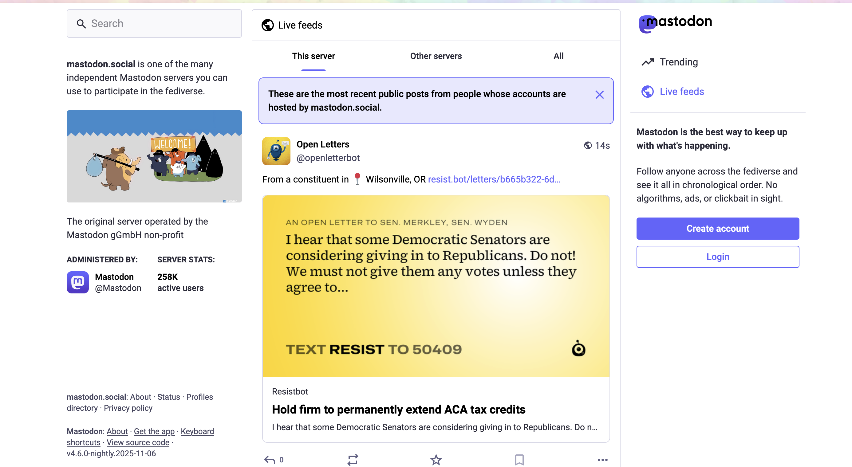 Mastodon.social home page, showing the live feed of most recent messages from members.