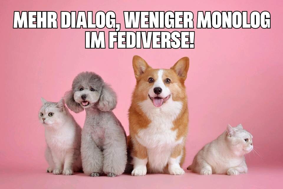 Foto von einer Katze, einem Hund, einem Hund und einer Katze, die nebeneinander sitzen. DarΓΌber steht: Mehr Dialog, weniger Monolog im Fediverse!