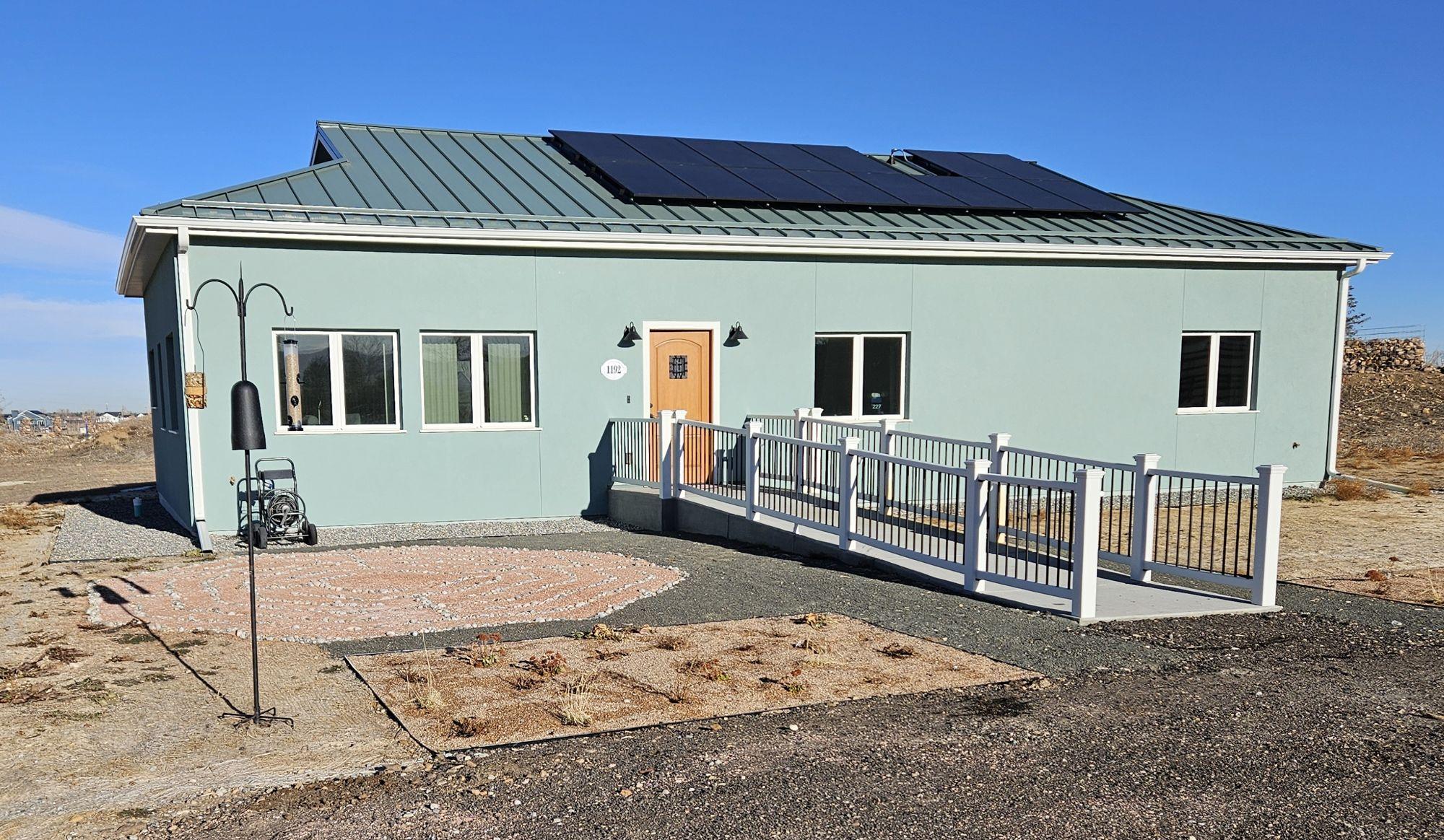 A photo from Dec. 2024 of a small green house with white trim and an orange front door on a mostly bare replanted building plot.There are solar panels on the green metal roof. In the foreground are a metal stand holding bird feeders, a prospective flower bed, and a meditation labyrinth done in whites stones on pink gravel. The sky is bright blue with a few wispy clouds showing.