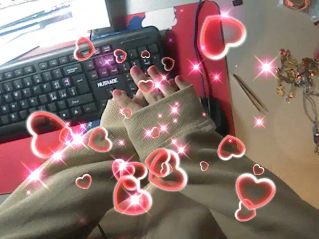 Foto fatta col 3DS e i cuoricini delle mie manine dentro le maniche tirate, con le mani sovrapposte che mostrano appena le dita.