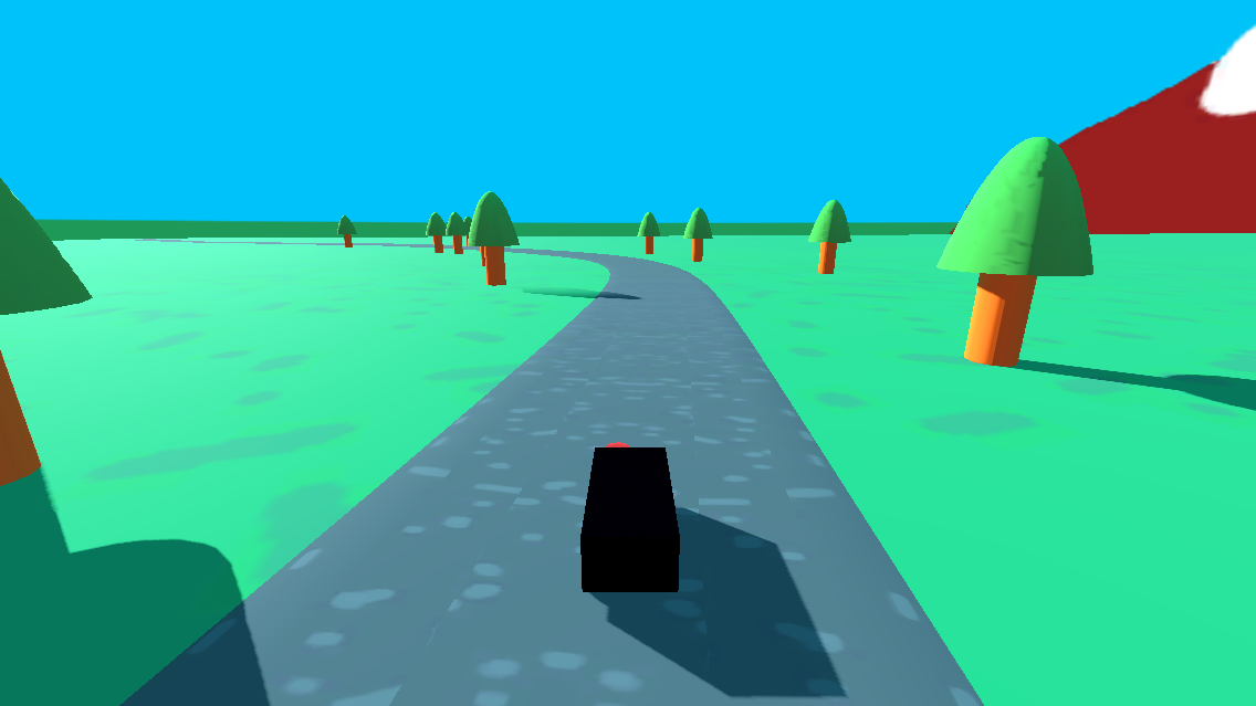 Una schermata del videogioco che sto sviluppando da anni con una lentezza esasperante ma che ora che ho tempo libero magari posso cercare di finire. Si tratta di un pezzo di strada con alberi e montagne, un'auto, tutto quanto crudemente modellato 3D.