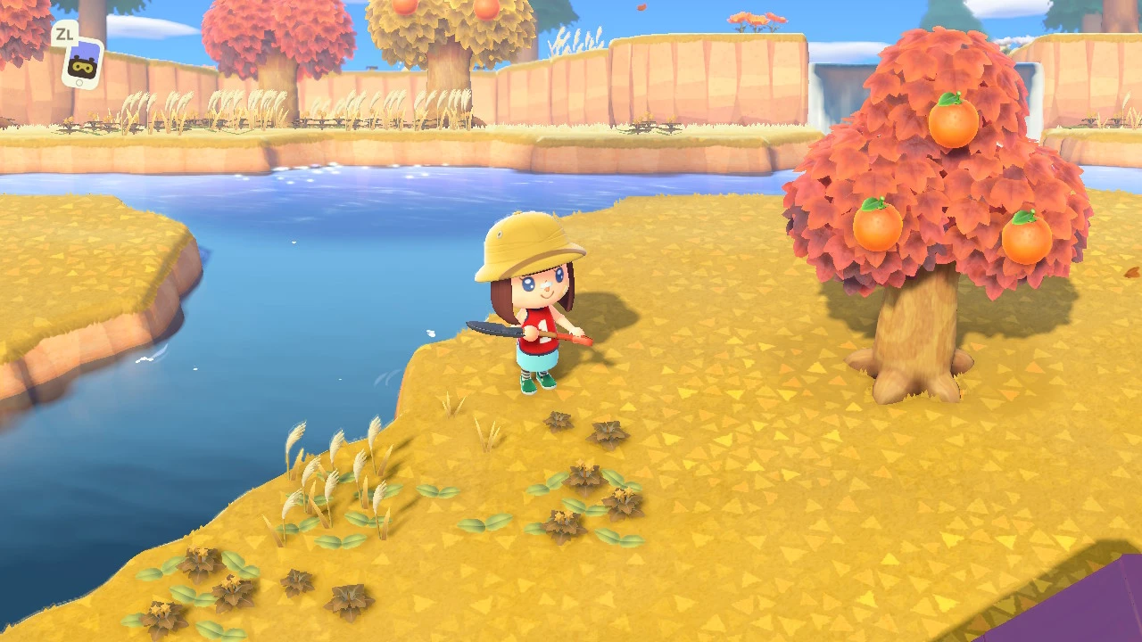 Foto piΓΉ in dentro l'isola, con un albero di arance dalle foglie marroni secche e a terra le erbacce.