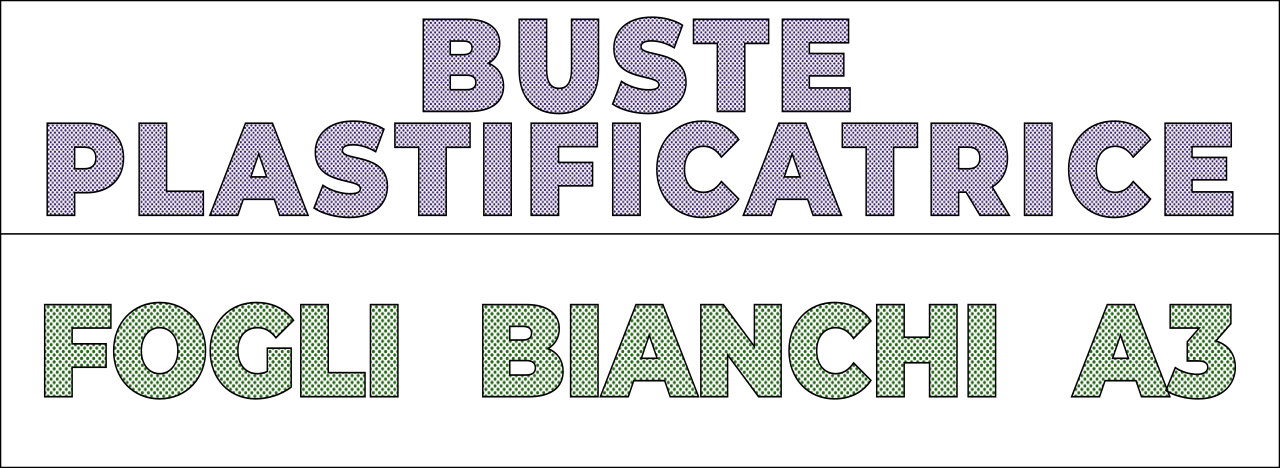 Scritte "Buste olastificatrice", a pallini viola, e "Fogli bianchi A3", a pallini verdi.