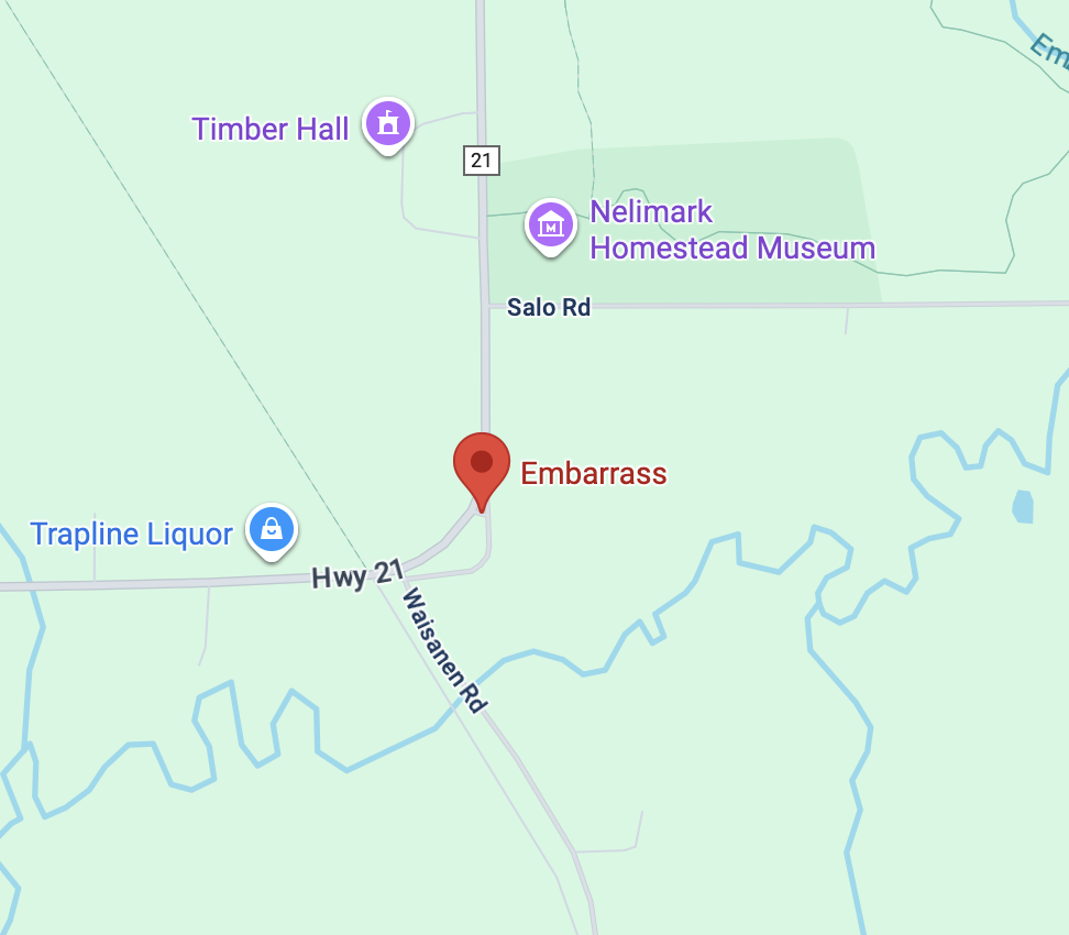 A screenshot of a map showing the town of Embarrass in Minnesota, USA. It's quite rural and has a squiggly river going along the south of it.