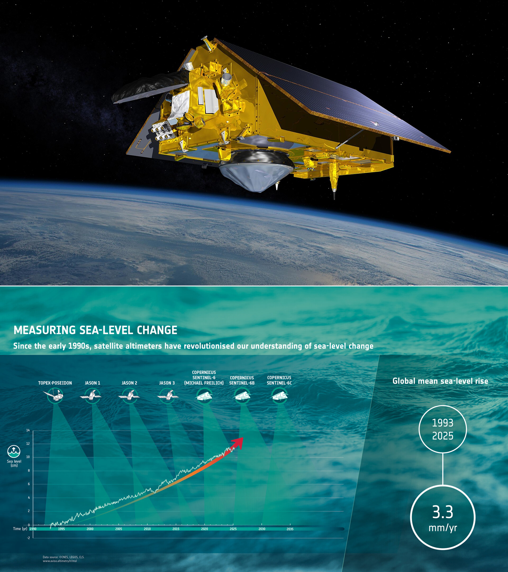 1. Graphic of the Sentinel-6B satellite over earth. https://en.wikipedia.org/wiki/Sentinel-6B 2. Graph of se-level rise since 1993. https://www.esa.int/Applications/Observing_the_Earth/Copernicus/Sentinel-6/Sentinel-6B_launched_to_extend_record_of_sea-level_rise