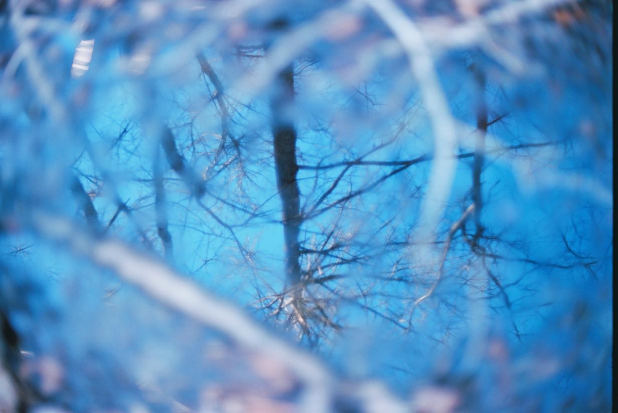 A color film photograph taken with Nikon F3 using Kodak Cinestill 400D film. This is the surface of a pond showing the mirrored image of skeletal trees that appear upside-down in a mirrored blue sky. Branches or surface detritus are out of focus and seem to frame the watery image so that the effect is like peering through a pinhole, perhaps. It's disorienting but also like a beautiful, confusing dream.