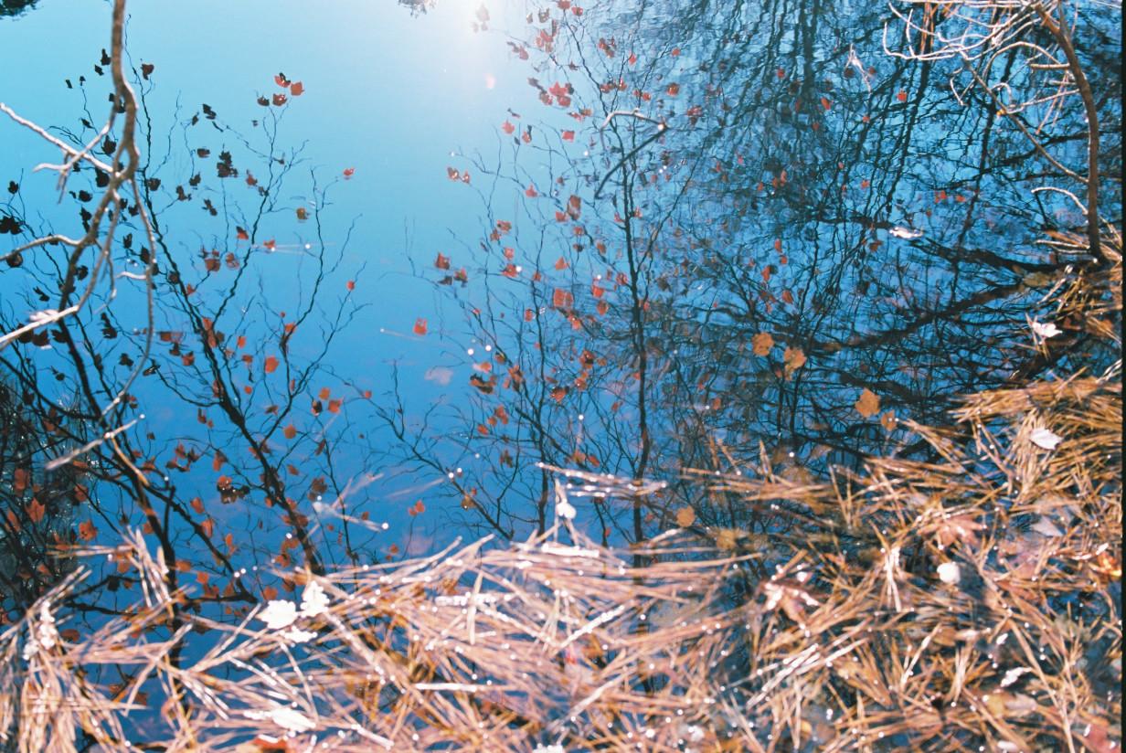 A color film photograph taken with my Nikon F3 using Kodak Cinestill 400D film. The surface of a pond reflects sunlight, sky, and spindly trees with autumn leaves. The sky is bright blue, fading into the sunlight towards the top of the frame. Appearing upright in the image are the watery reflections a few nearly bare saplings or perhaps branches that extend from the bank of the pond behind the photographer. Their small orange leaves are bright with sunshine and seem to hang in the air like confetti frozen in time. Reflections of larger trees on the other banks of the pond encroach from the left and right of the frame. The bottom of the frame is filled with pale orange pine needles that have collected on the surface of the pond, forming a mat that looks almost like a woven carpet. At the left of the frame, a single nearly white branch reaches down into the pond's surface to break the spell.