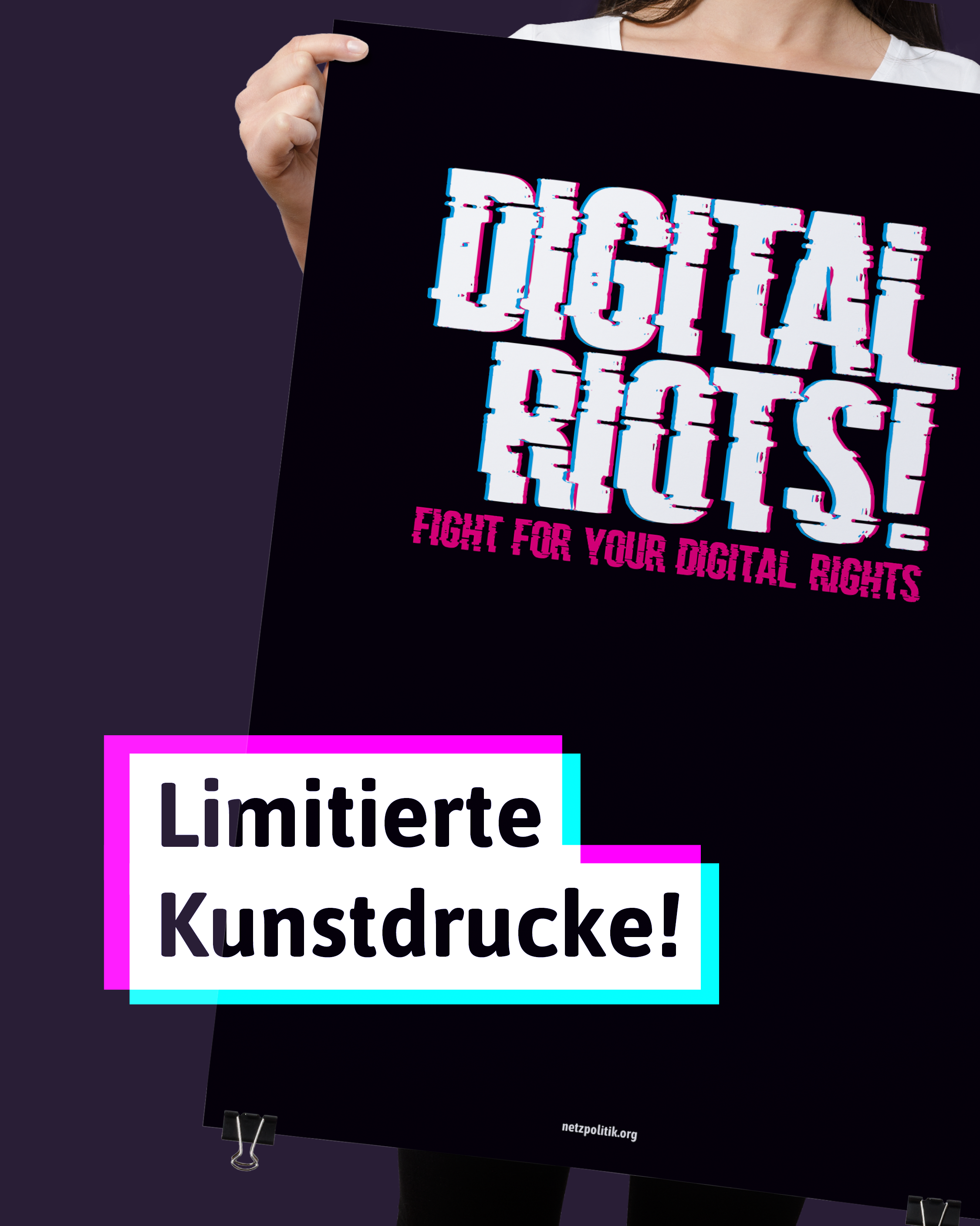 Person hรคlt ein Plakat in hoch. Aufschrift: Digital Riots! Fight for your digital rights. Darunter Text: Limitierte Kunstdrucke