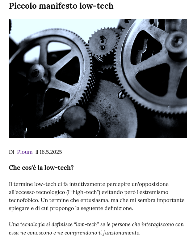 Nella foto sono ritratti degli ingranaggi Piccolo manifesto low-tech Di Ploum il 16.5.2025 Che cos'รจ la low-tech? Il termine low-tech ci fa intuitivamente percepire un'opposizione all'eccesso tecnologico (l'โhigh-techโ) evitando perรฒ l'estremismo tecnofobico. Un termine che entusiasma, ma che mi sembra importante spiegare e di cui propongo la seguente definizione. Una tecnologia si definisce โlow-techโ se le persone che interagiscono con essa ne conoscono e ne comprendono il funzionamento.