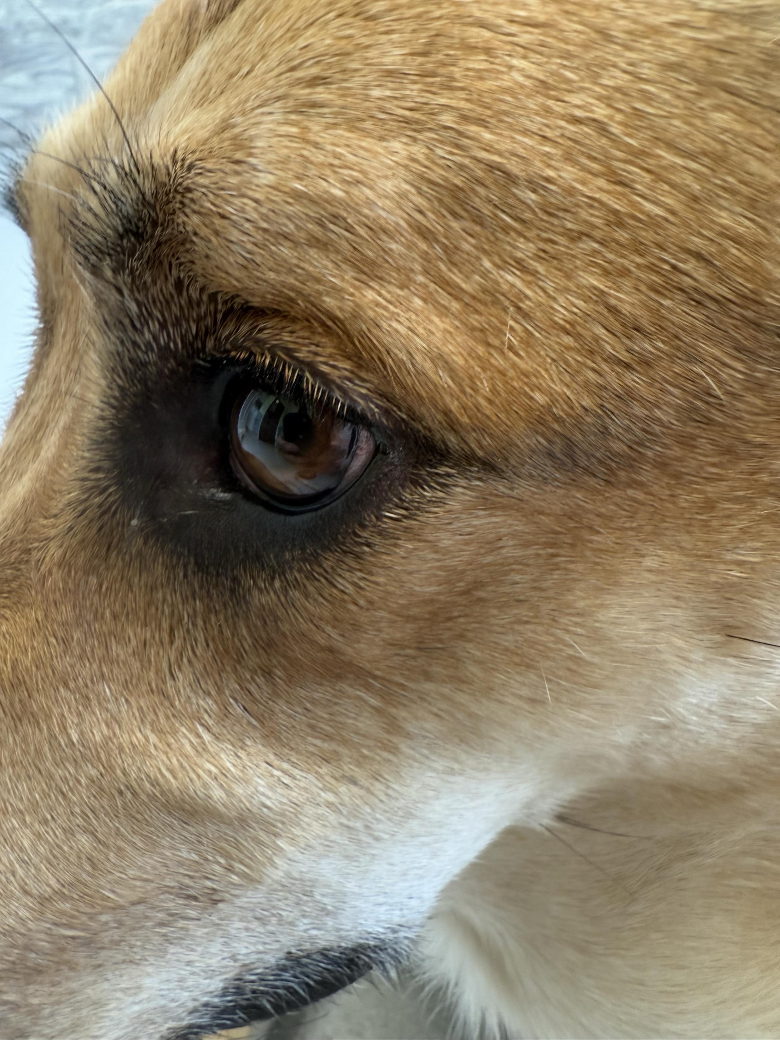 An extreme close-up of Molly's left eye. I told her that her eyeshadow is very fashionable right now. She is a light brown dog with black eyelashes and black eyeliner that runs way up toward her ear.