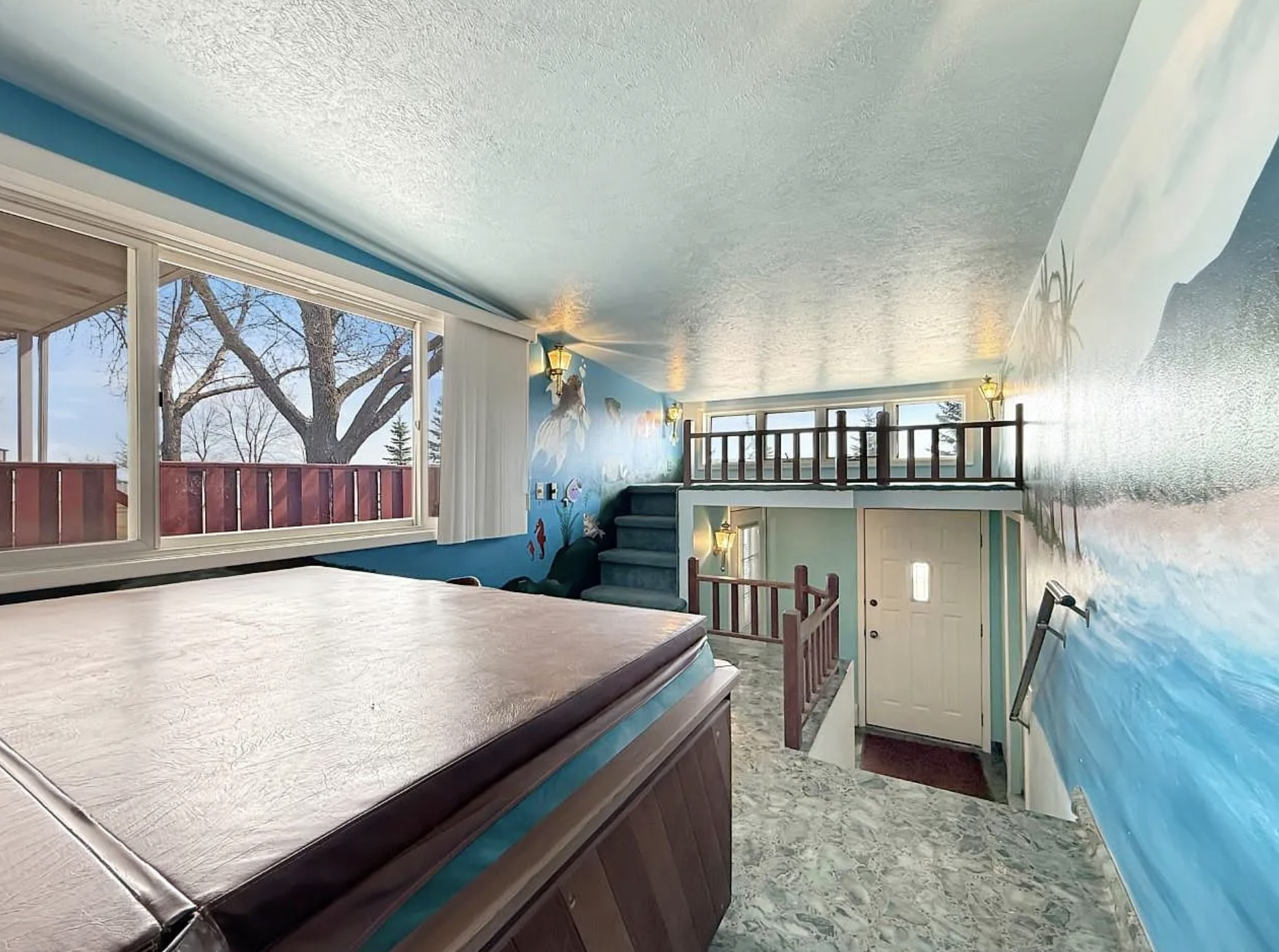 A landing right near the front door that has a hot tub, and at the far end of the area is some stairs going up to a very small platform with nothing on it. There are also murals painted on the wall, with an ocean and mountain scene.
