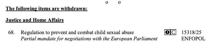 Das Bild zeigt einen Ausschnitt eines offiziellen englischsprachigen Dokuments. Unter der Überschrift „The following items are withdrawn:“ (Die folgenden Punkte werden zurückgezogen) ist unter der Rubrik „Justice and Home Affairs“ (Justiz und Inneres) der Punkt 68 aufgeführt. Dieser betrifft die „Regulation to prevent and combat child sexual abuse“ (Verordnung zur Prävention und Bekämpfung des sexuellen Missbrauchs von Kindern) und spezifisch das „Partial mandate for negotiations with the European Parliament“ (Teilmandat für Verhandlungen mit dem Europäischen Parlament). Rechts stehen die Dokumentennummer 15318/25 und das Kürzel ENFOPOL.