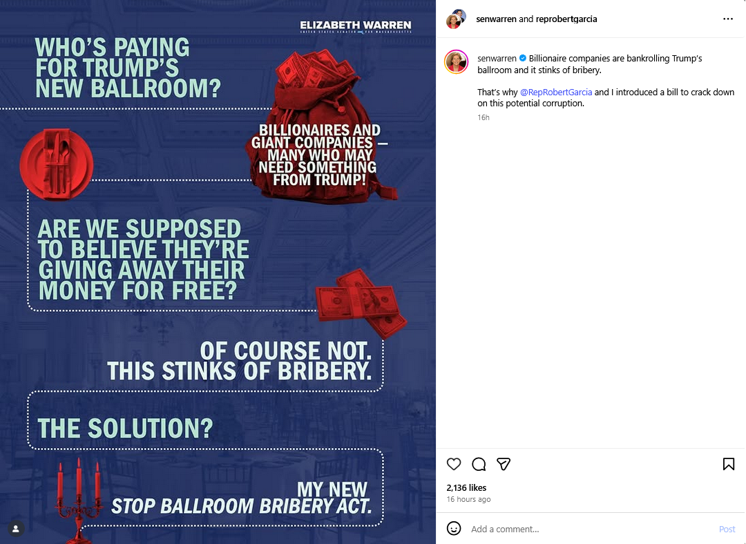 Instagram post by Sen. Warren https://www.instagram.com/p/DRNX1cdkWiV/