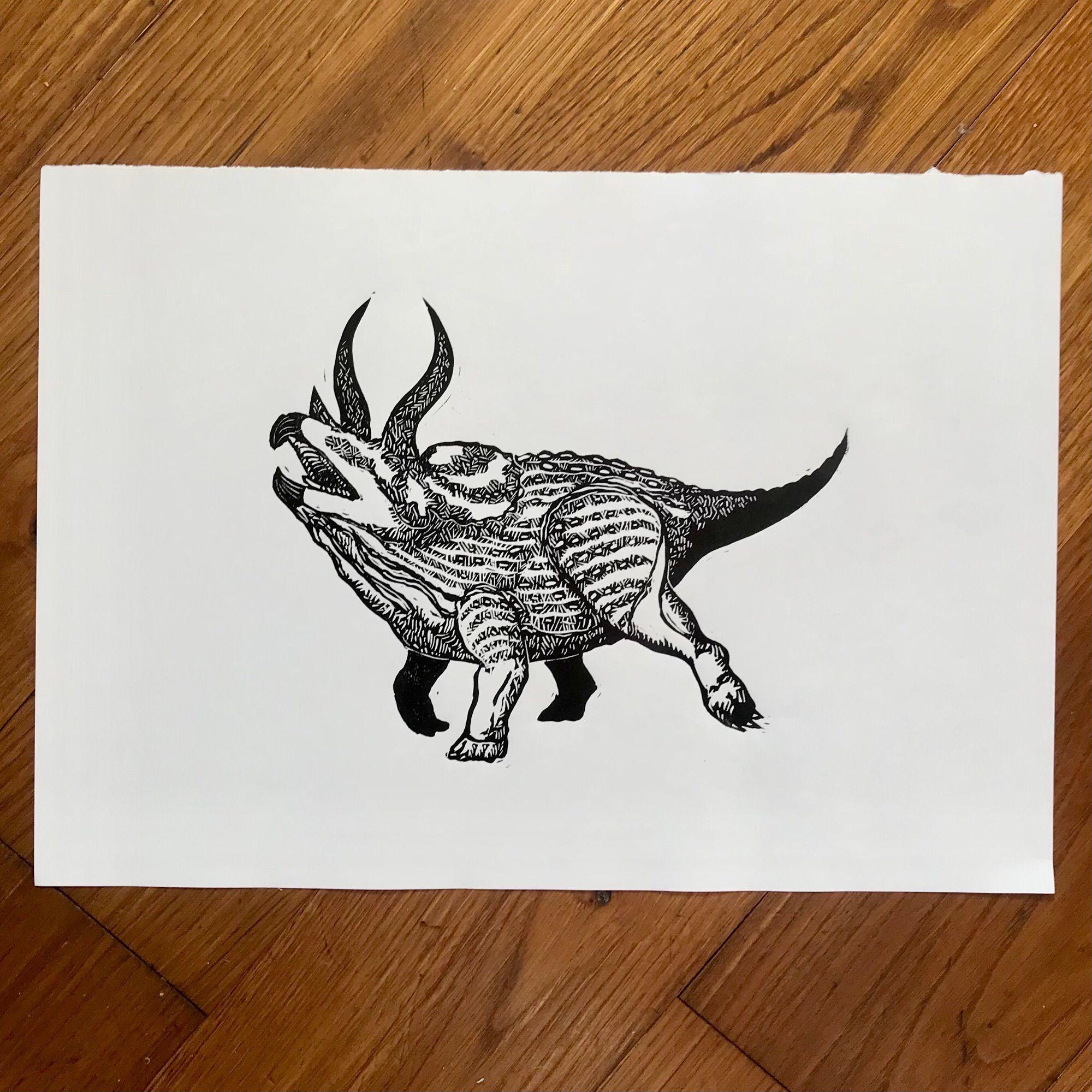 Petite estampe noir et blanc d'un tricΓ©ratops en train de courir