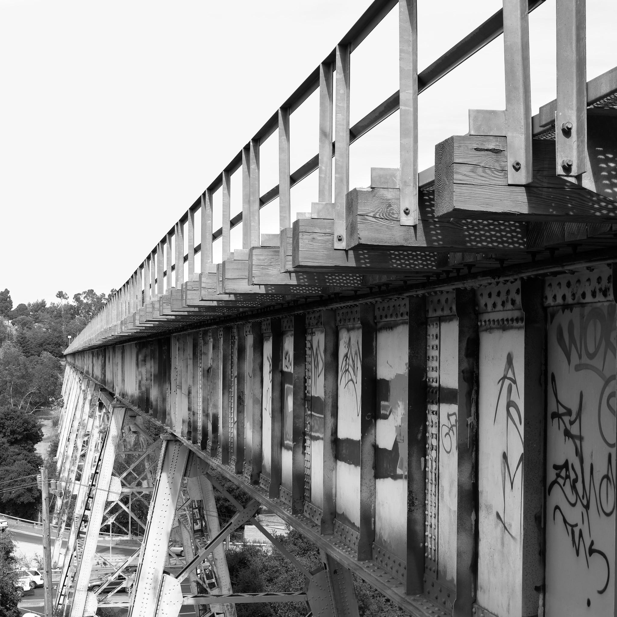 A tall steel railroad trestle over a highway, converging at the left of the frame. There's graffiti on the side of the trestle.