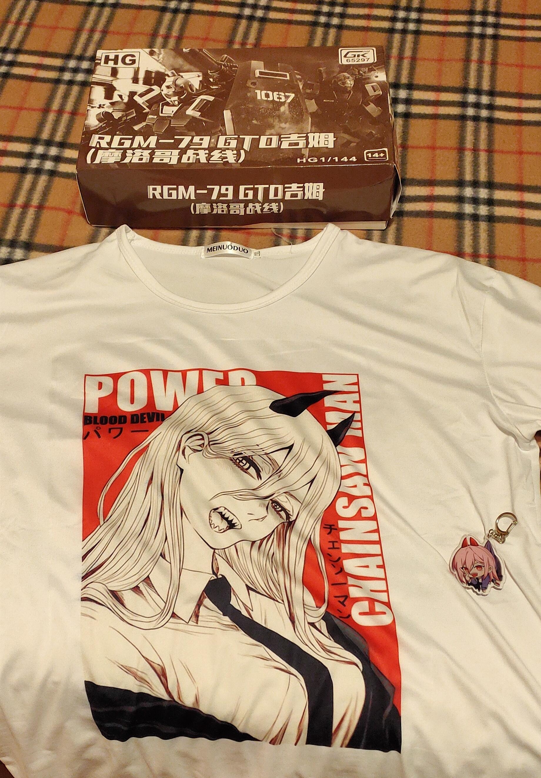 In alto un kit da montare di Gundam, sotto una t-shirt con il mezzo busto di Power di Chainsaw Man e il ciondolo portachiavi sempre di Power!