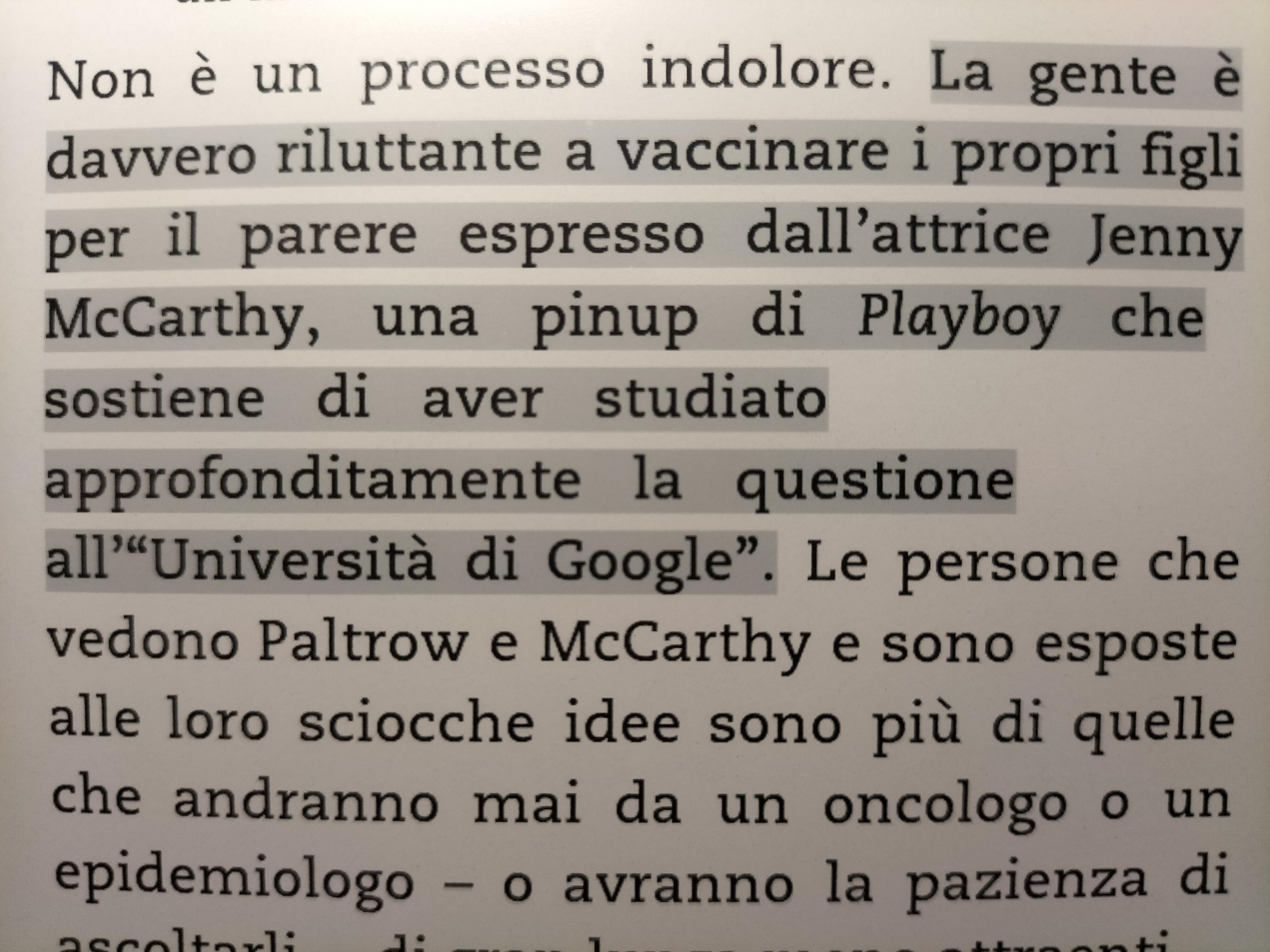 La gente Γ¨ davvero riluttante a vaccinare i propri figli per il parere espresso dall'attrice Jenny McCarthy, una pinup di Playboy che sostiene di aver studiato approfonditamente la questione all' "UniversitΓ di Google".