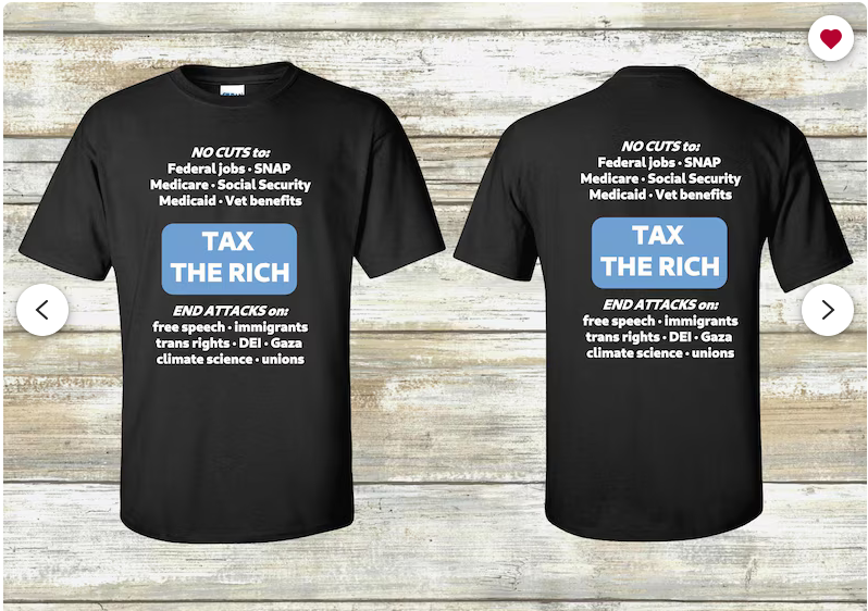 Photo of 2-sided black t-shirt with text: NO CUTS to: Federal jobs - SNAP Medicare - Social Security Medicaid - Vet benefits TAX THE RICH END ATTACKS on: free speech - immigrants trans rights - DEI - Gaza climate science - unions