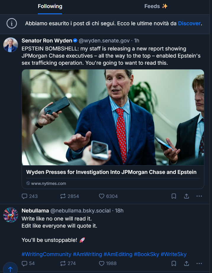 i primi risultati del mio feed discover su bluesky: una notizia su Epstein (link al new york times) e una fase motivazionale random