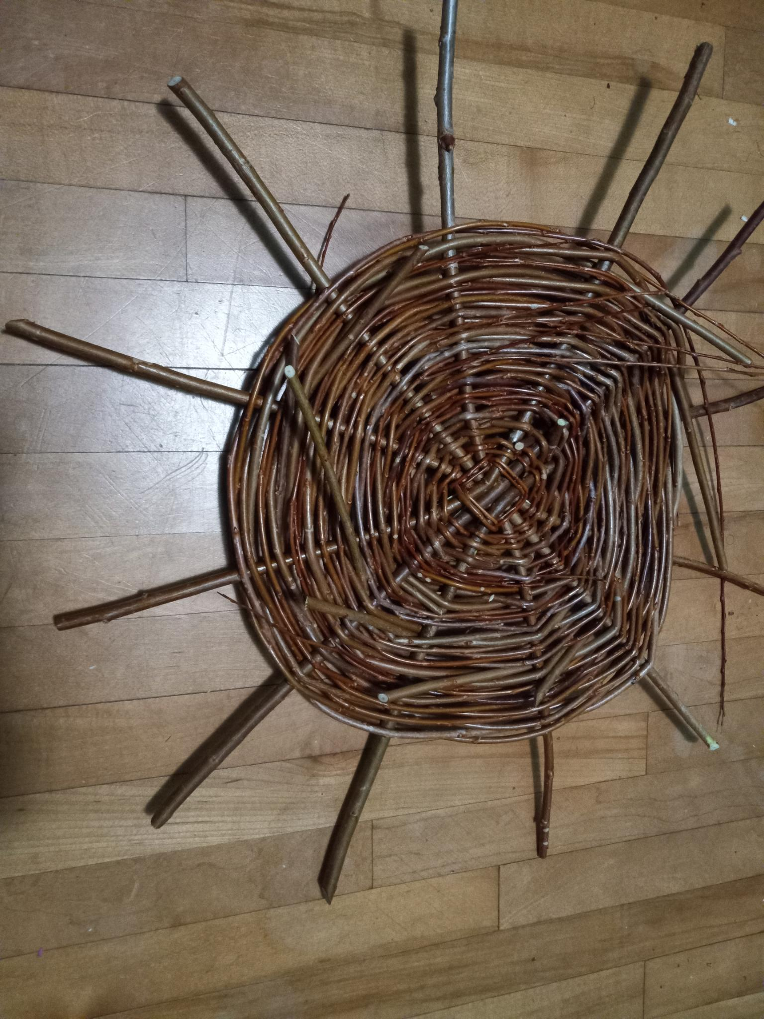 The beginning of the bottom of a round, woven willow basket. There are 12 sticks poking out of concentric woven circles of willow. The circle is sitting on a wooden floor.