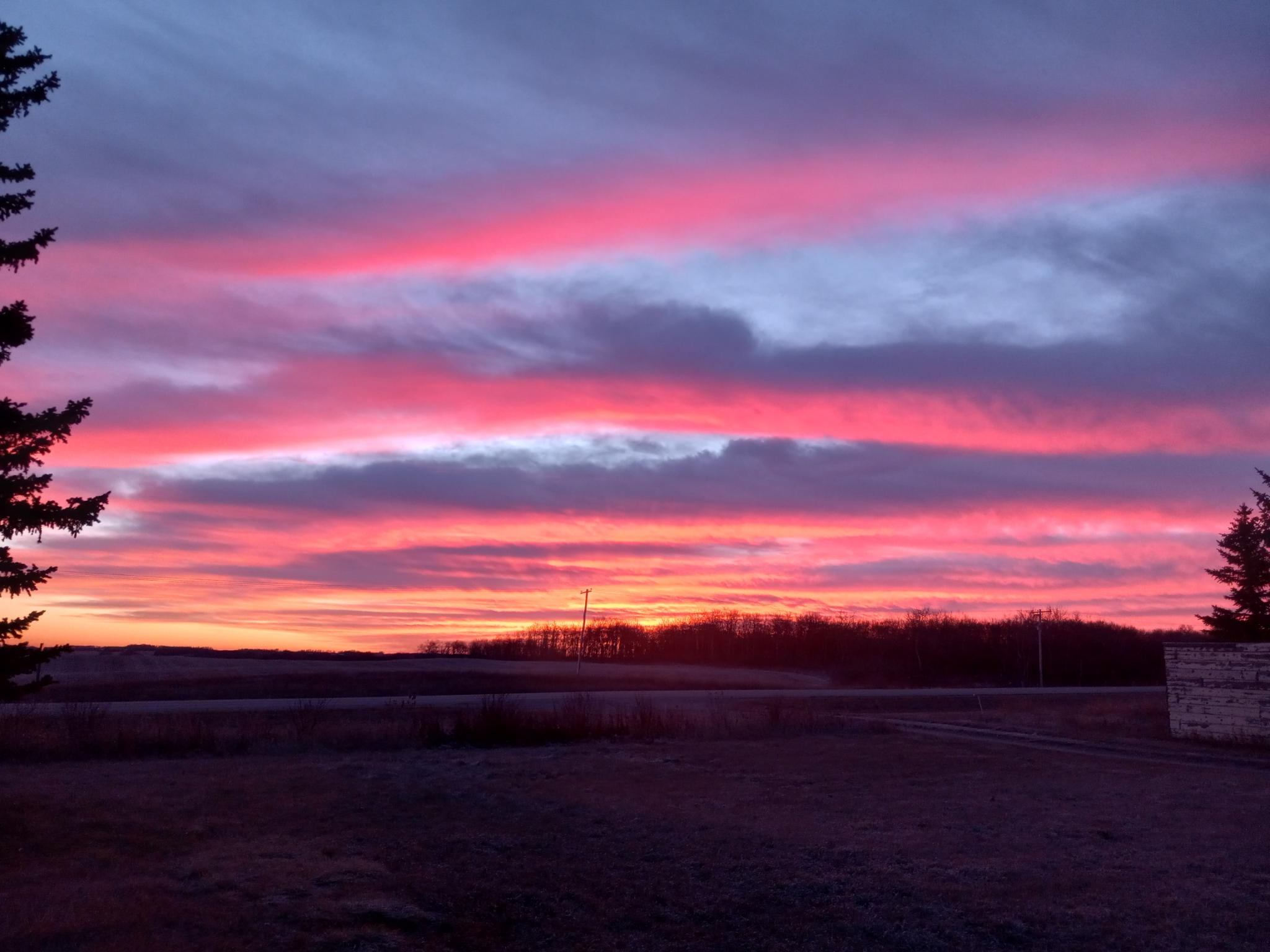 Looking toward a fairly flat horizon with some scrubby woods, under orange and pink horizontal bands of sunrise clouds, with blue sky peeking in between the clouds.