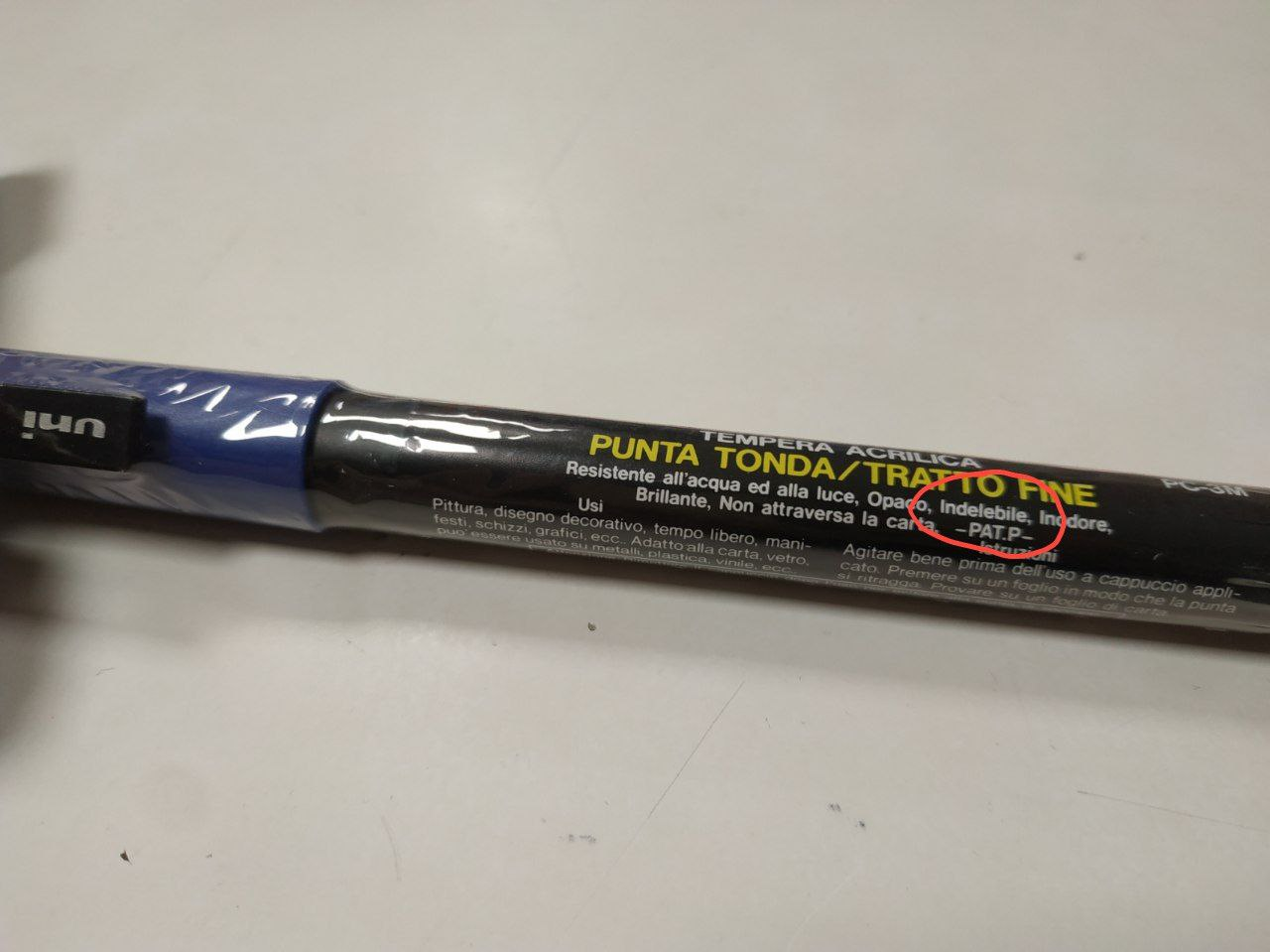 Foto di un pennarello uniposca, dettaglio dell'etichetta dove tra le altre cose รจ indicato che รจ indelebile.