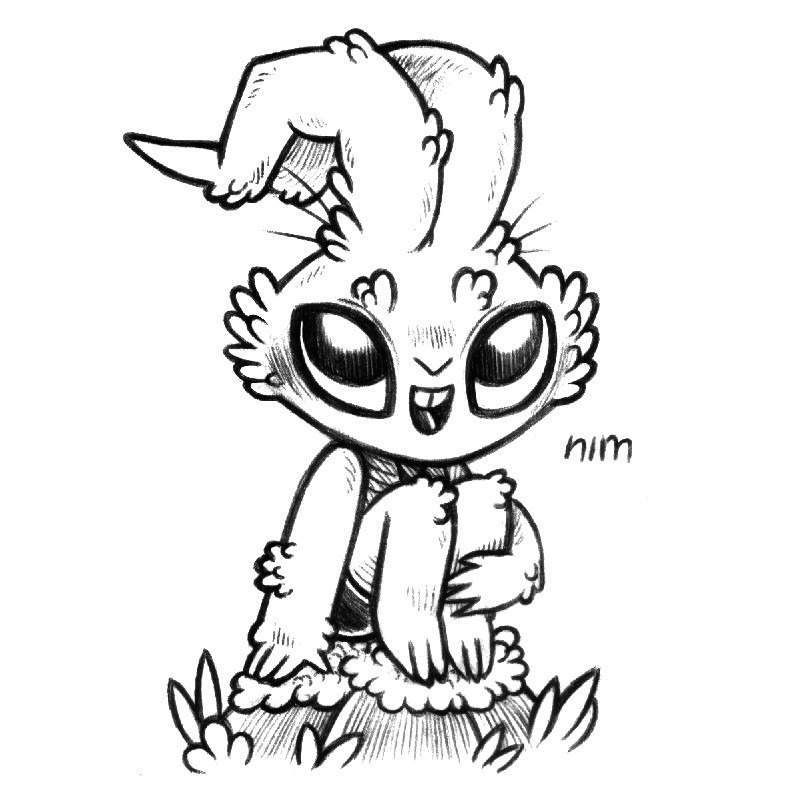 a drawing of a humanoid rabbit named Nim, sitting on a tufted rock, holding their knees against their chest and smiling. They ears are thick and folded backwards. They have little nubby tufts of fur all over their body.