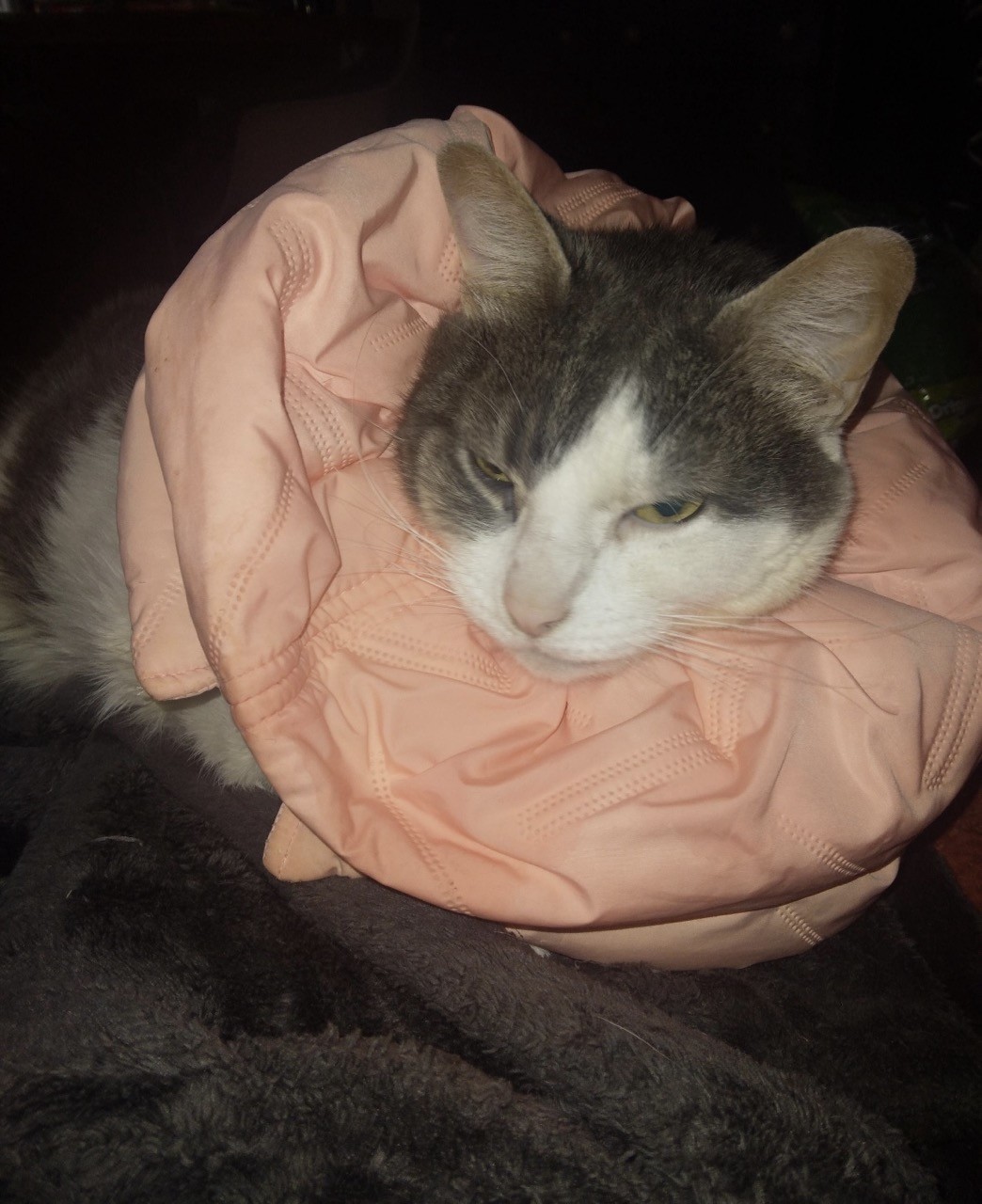 sweet kitty Mimi, tuxedo-tabby wearing a donut collar.
