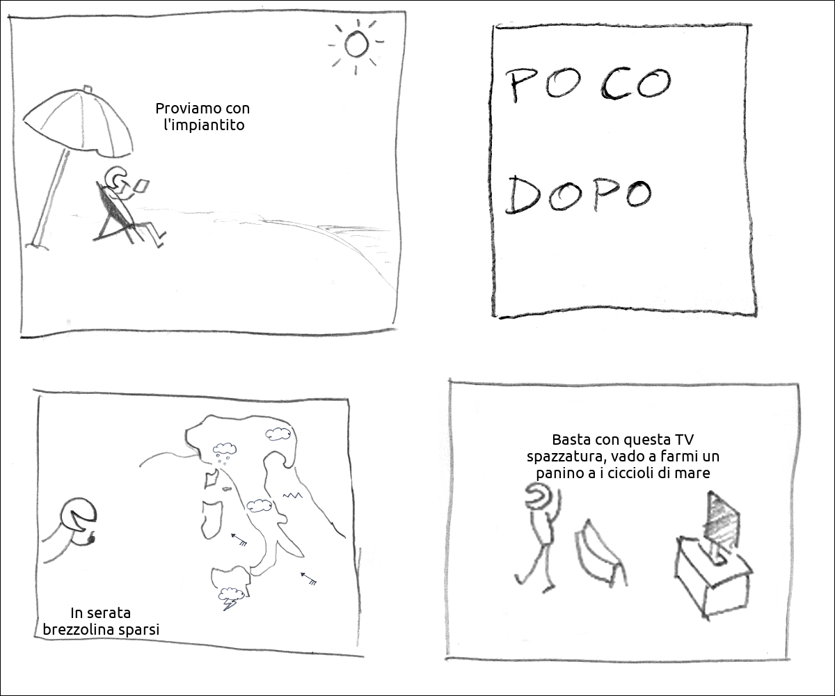 Un tizio sulla spiaggia sotto l'ombrellone dice: «Proviamo con l'impiantito» didascalia: poco dopo Il tizio delle previsioni dice: «In serata brezzolina sparsi» mentre mostra la cartina d'Italia il tizio spegne la TV e dice: «Basta con questa TV spazzatura, vado a farmi un panino a i ciccioli di mare »