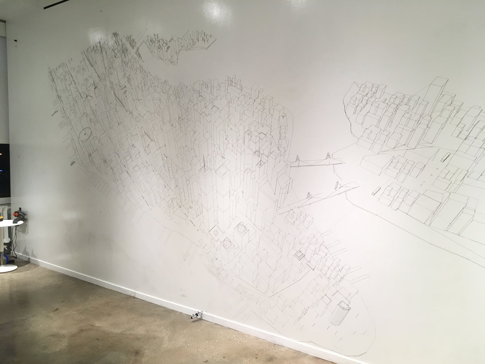 3D rendering of Manhattan plotted on a large white wall