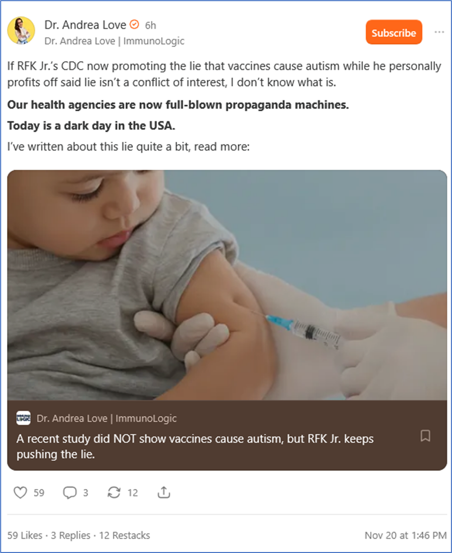Post by Dr. Andrea Love Dr. Andrea Love | ImmunoLogic If RFK Jr.βs CDC now promoting the lie that vaccines cause autism while he personally profits off said lie isnβt a conflict of interest, I donβt know what is. Our health agencies are now full-blown propaganda machines. Today is a dark day in the USA. Iβve written about this lie quite a bit, read more: