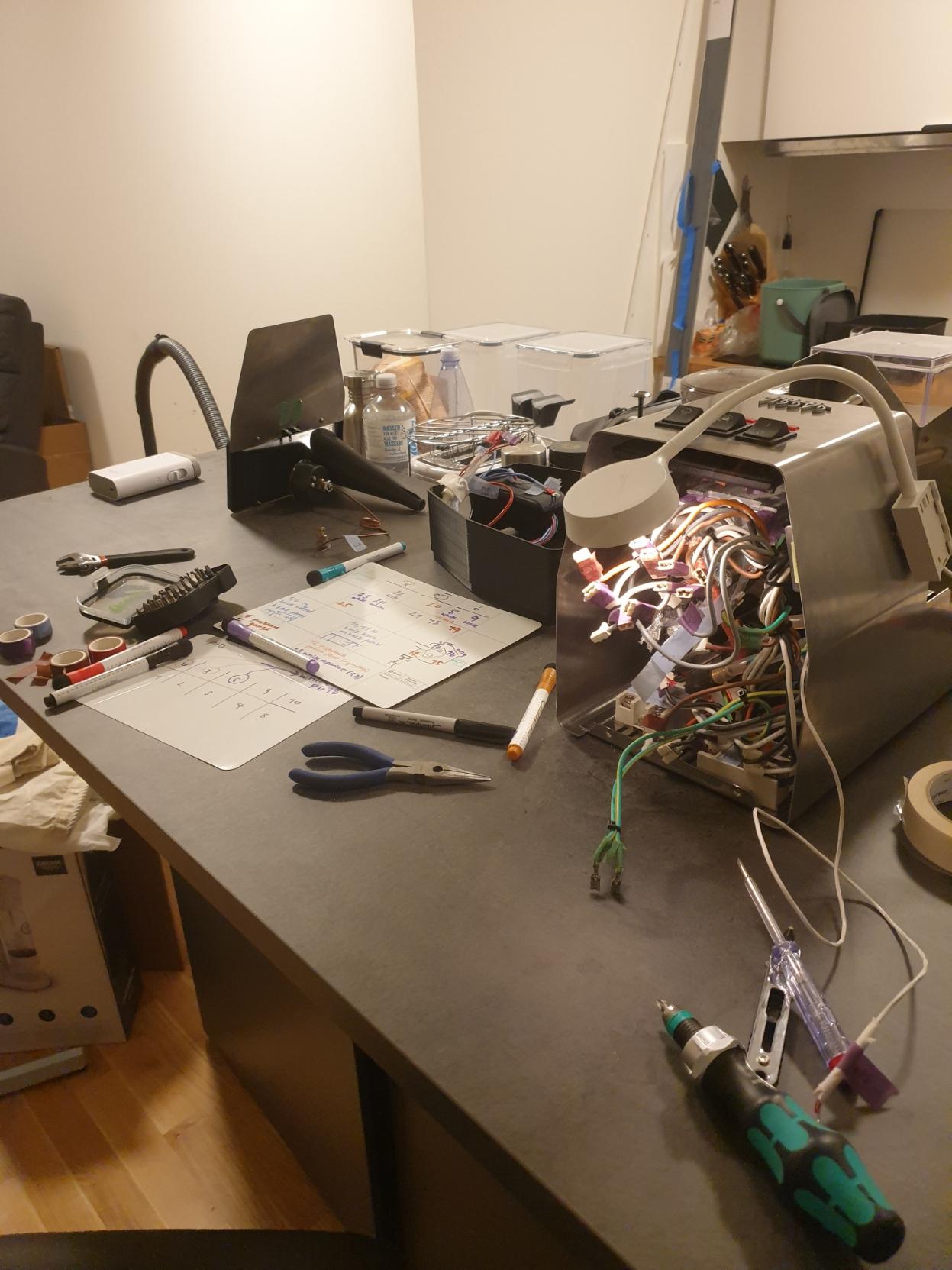 Zoom out to the kitchen counter that has been taken over by parts and tools in a messy but careful manner.