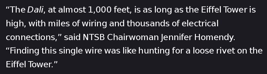 βThe Dali, at almost 1,000 feet, is as long as the Eiffel Tower is high, with miles of wiring and thousands of electrical connections,β said NTSB Chairwoman Jennifer Homendy. βFinding this single wire was like hunting for a loose rivet on the Eiffel Tower.β