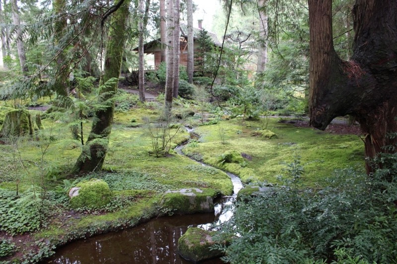 The Moss Garden at Bloedel Reserve, designed by Richard Haag. A thin, gentle stream winds through a sparse woodland of Birch and Hemlock underlain by a thick carpet of emerald green moss, punctuated occasionally by ferns, small shrubs, and trailing ground covers.