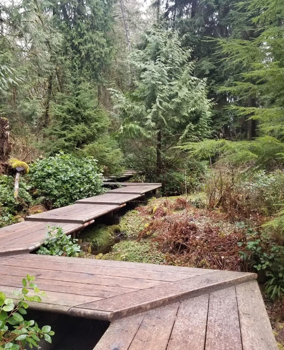 The Moss Garden at Bloedel Reserve, designed by Richard Haag. An angular, stepped boardwalk levitates above a mossy, wet shrubland and disappears into an evergreen woodland in the distance.