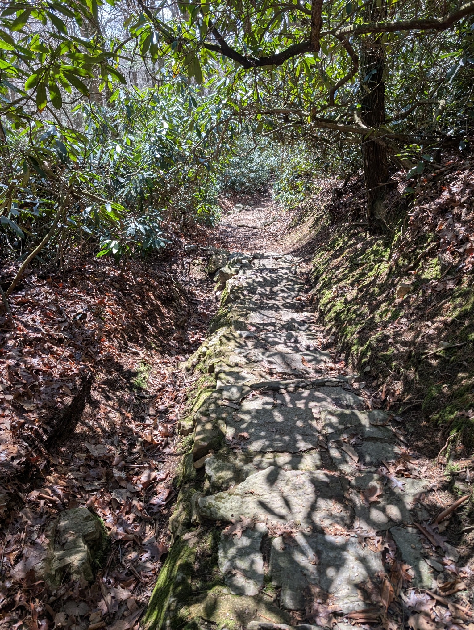 A staircase made of solid dry-laid stone descends a narrow pathway shaded by giant Rhododendrons and Mountain Laurels. A deep gutter next to the staircase is lined with stones to reduce erosion and curves away from the trail at regular intervals (off to the left where the stone steps stop, then again further down the dirt trail) to let stormwater spread out over a wide hill immediately to the side of the trail, preventing the water from gaining too much velocity as it travels down the side of the trail.