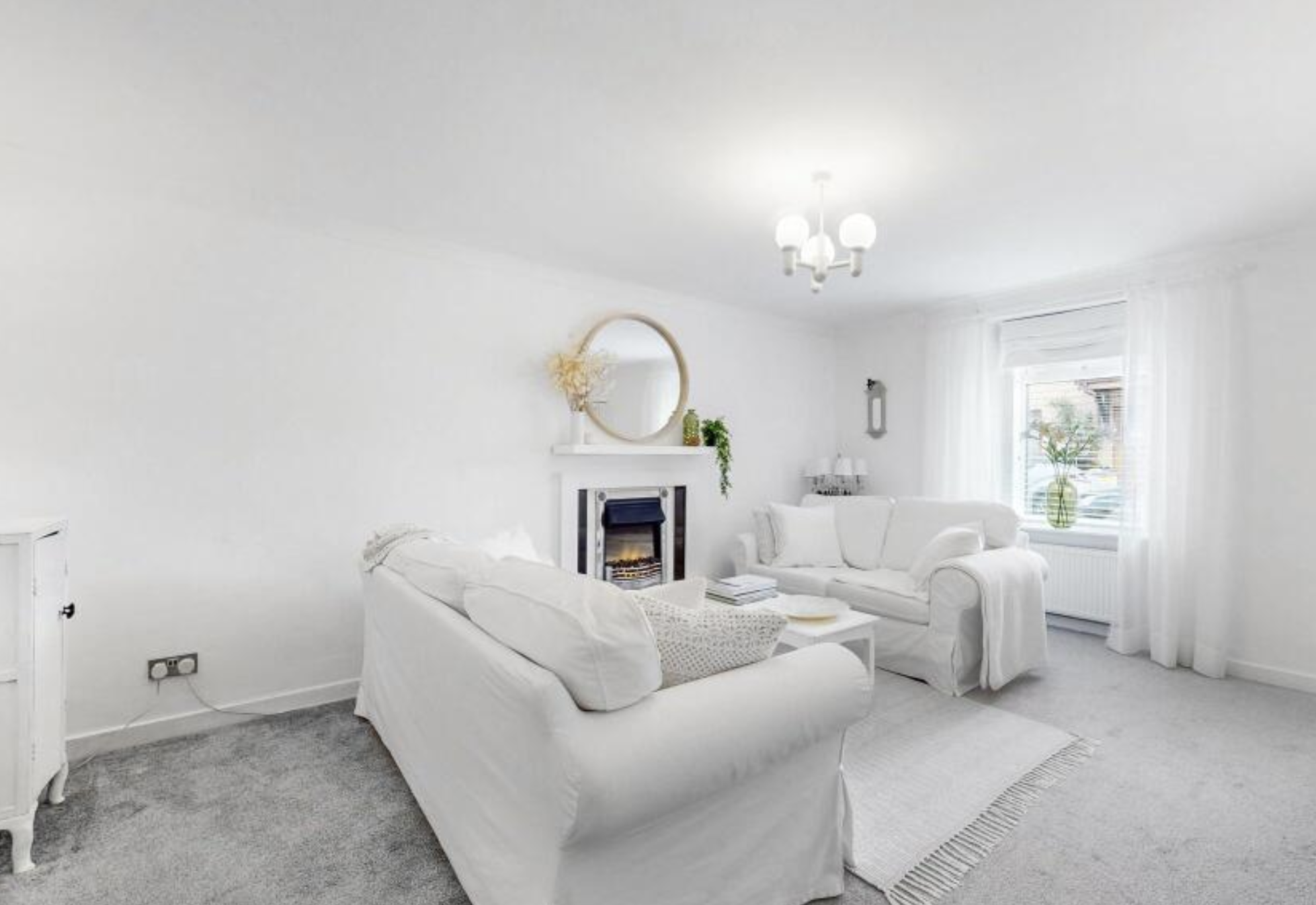 A living room with light grey carpet and bright white walls, ceiling, couch, curtains, throw blanket on the couch, and rug. There is a fireplace that is also white with a black accent and a gold mirror on it.