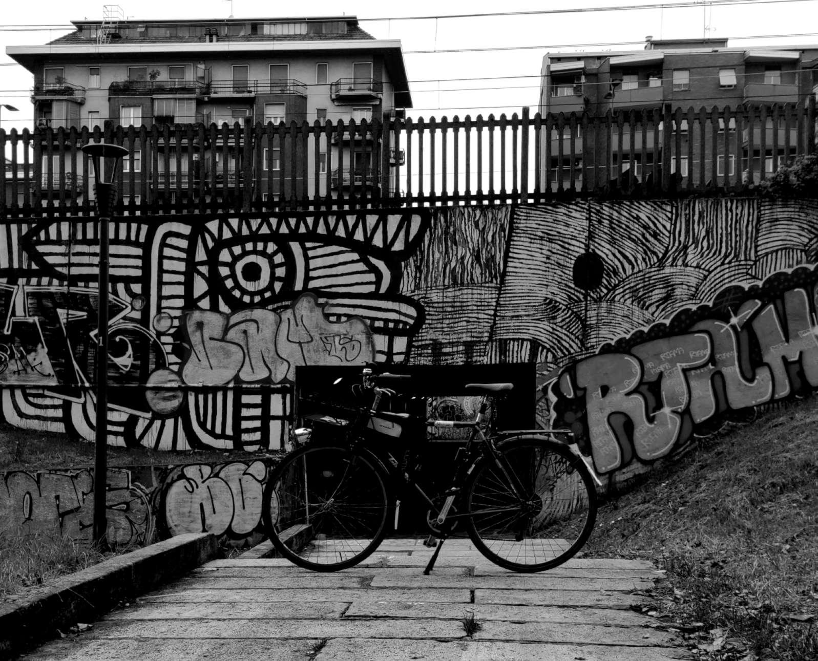 Foto b/n della mia bici incorniciata da un muro in cu c'รจ un tunnel pedonale. Sul muro ci sono vari murales e scritte. Sopra al muro si vedono due edifici residenziali.