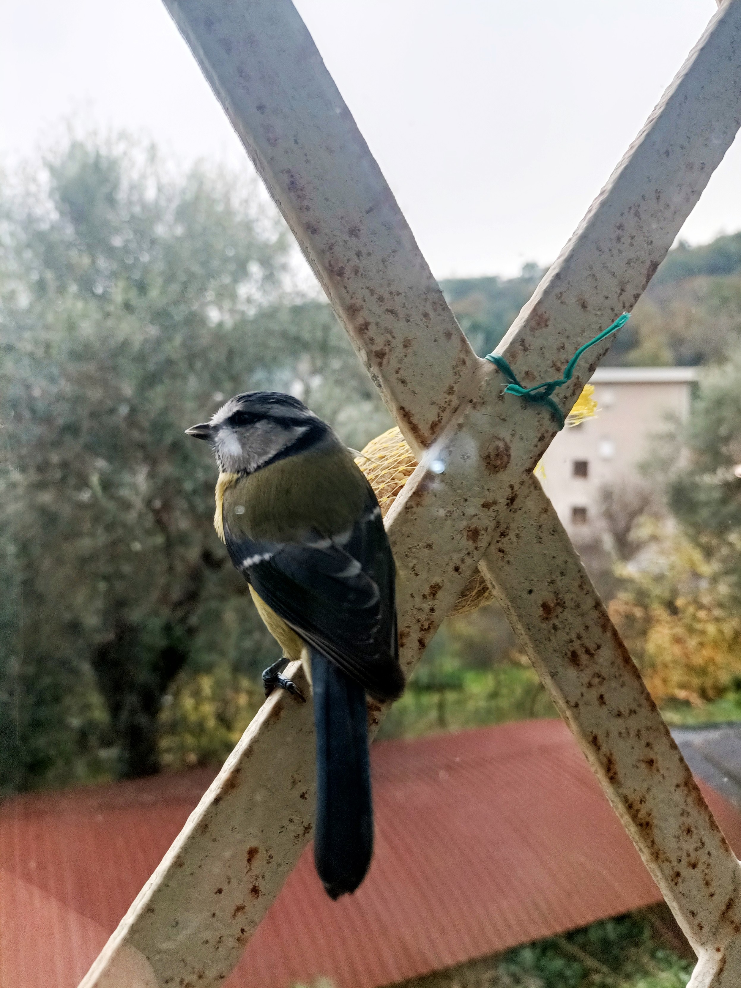 Una cinciallegra sulle sbarre di ferro di una finestra