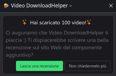 Screenshot che ritrae il seguente avviso del plugin Video DownloadHelper: "Hai scaricato 100 video! Ci auguriamo che Video DownloadHelper ti piaccia :) Ti dispiacerebbe scrivere una bella recensione sul sito Web del componente aggiuntivo?" Sotto al testo ci sono due pulsanti: "Lascia una recensione" e "Non chiedermelo piΓΉ".