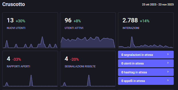 Cruscotto 25 ott 2025 - 23 nov 2025 13 +30% nuovi utenti 96 +8% utenti attivi 2.788 +14% interazioni 4 -33% rapporti aperti 4 -20% segnalazioni risolte 0 segnalazioni in attesa 0 utenti in attesa 0 hashtag in attesa 0 appelli in attesa