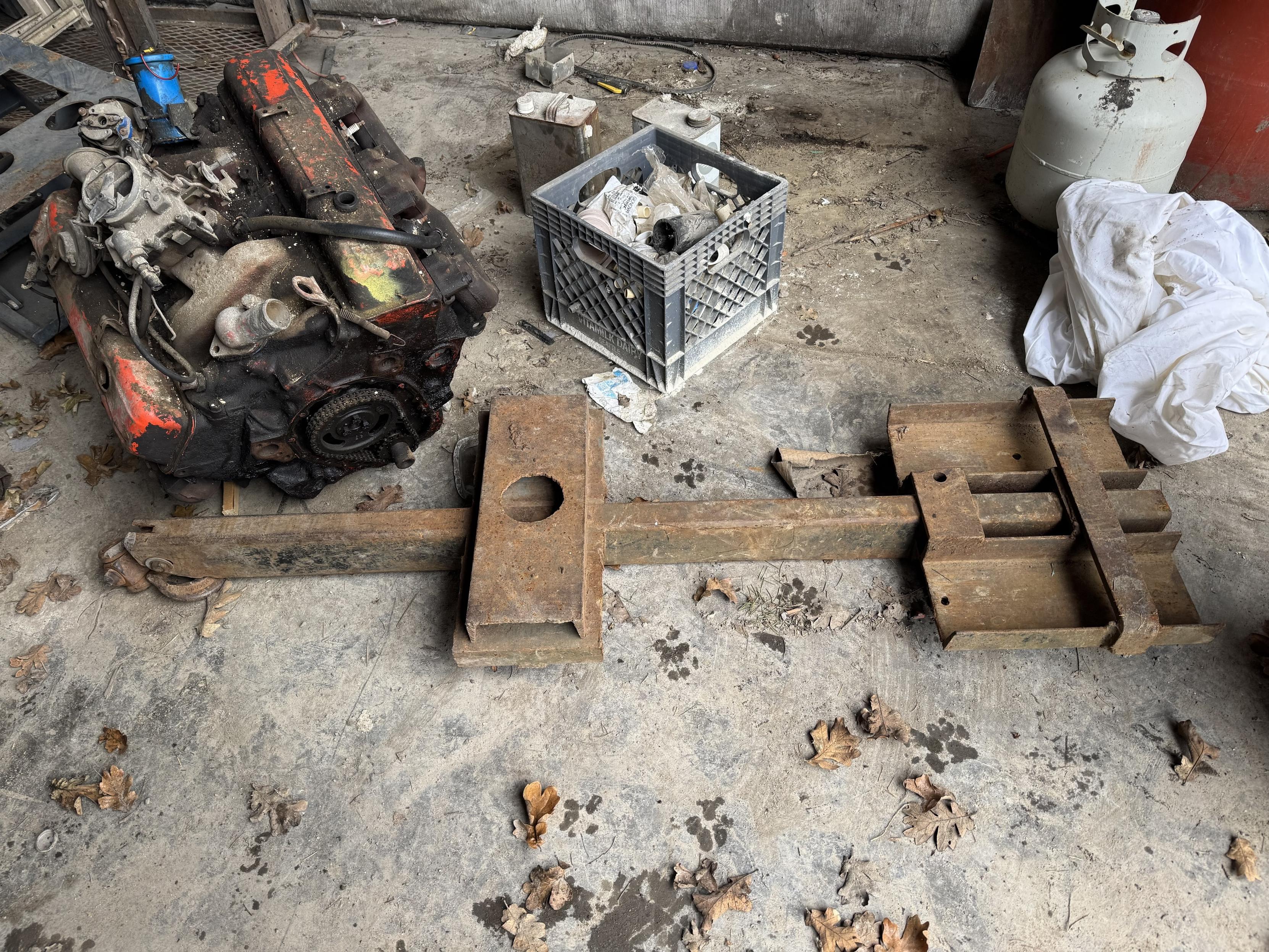 An industrial setting with a disassembled engine in the foreground and a large, heavy metal tool or fixture lying nearby. A plastic crate filled with miscellaneous items is also visible, along with a propane tank and a pile of white fabric. The floor is scattered with junk