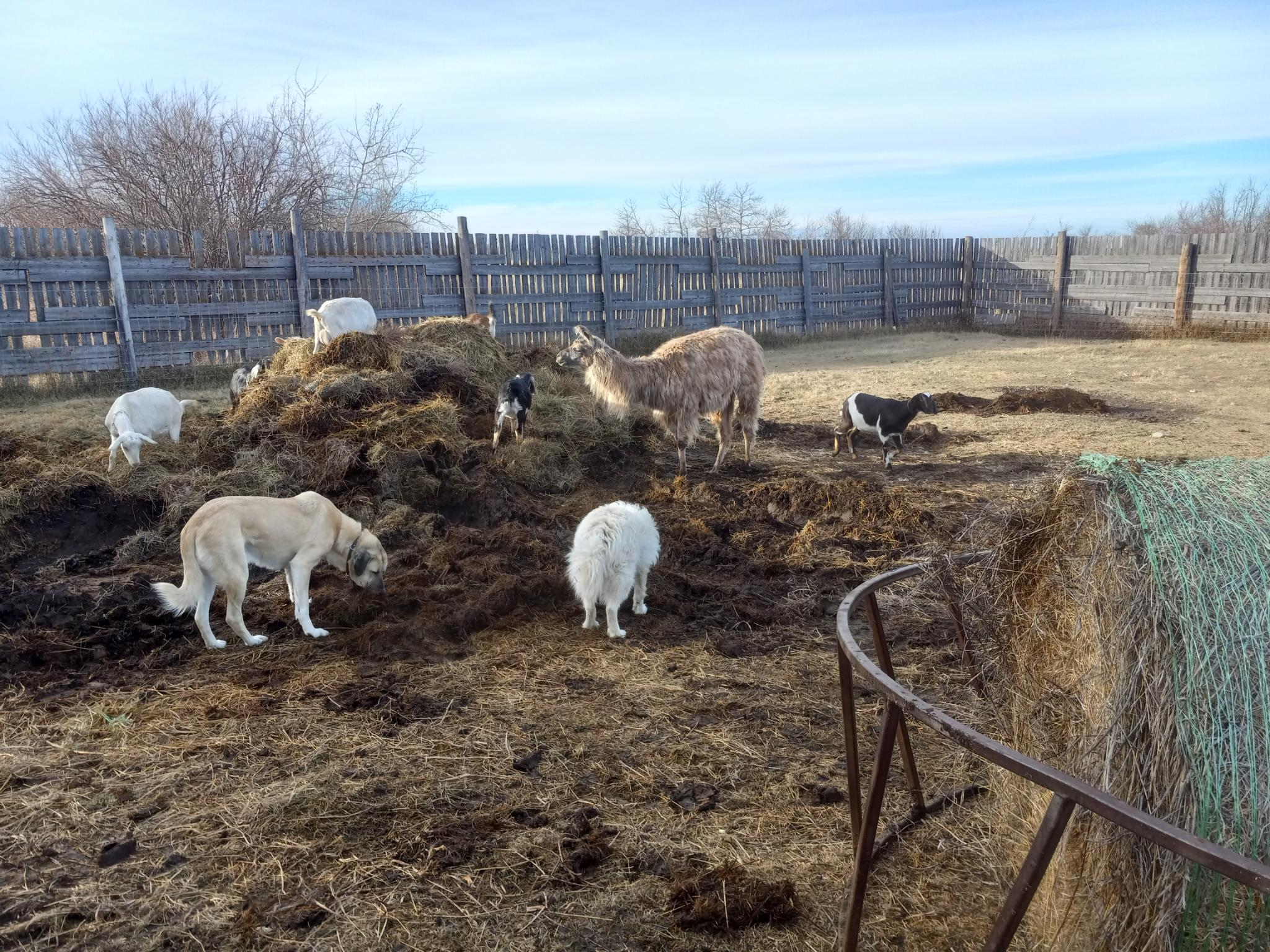 A couple of large floofy dogs, a llama, and a bunch of goats of various colours all climbing around on a compost pile. They're in a pen surrounded by a tall wooden fence. It's sunny and the sky is mostly cloudy with a few blue patches.