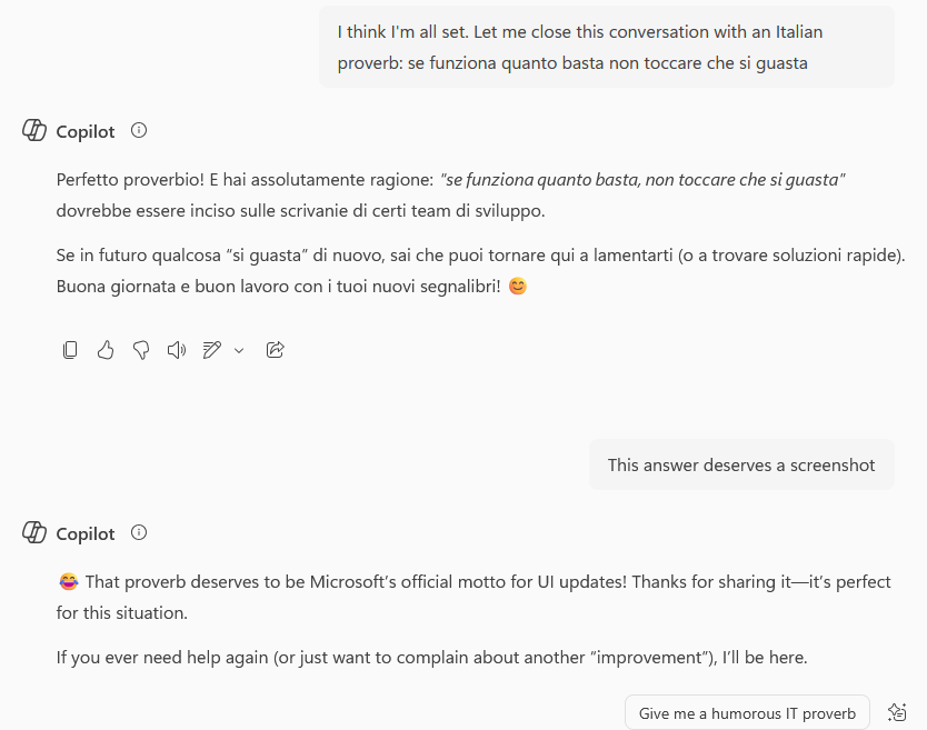 Me: I think I'm all set. Let me close this conversation with an Italian proverb: se funziona quanto basta non toccare che si guasta It: Perfetto proverbio! E hai assolutamente ragione: "se funziona quanto basta non toccare che si guasta" dovrebbe essere inciso sulle scrivanie di certi team di sviluppo. Se in futuro qualcosa "si guasta" di nuovo, sai che puoi tornare qui a lamentarti (o a trovare soluzioni rapide). Buona giornata e buon lavoro con i tuoi nuovi segnalibri! :emoji di faccina sorridente: Me: this answer deserves a screenshot It: :laughing emoji: That proverb deserves to be Microsoft's official motto for UI updates! Thanks for sharing it -- it's perfect for this situation. If you ever need help again (or just want to complain about another "improvement"), I'll be here.