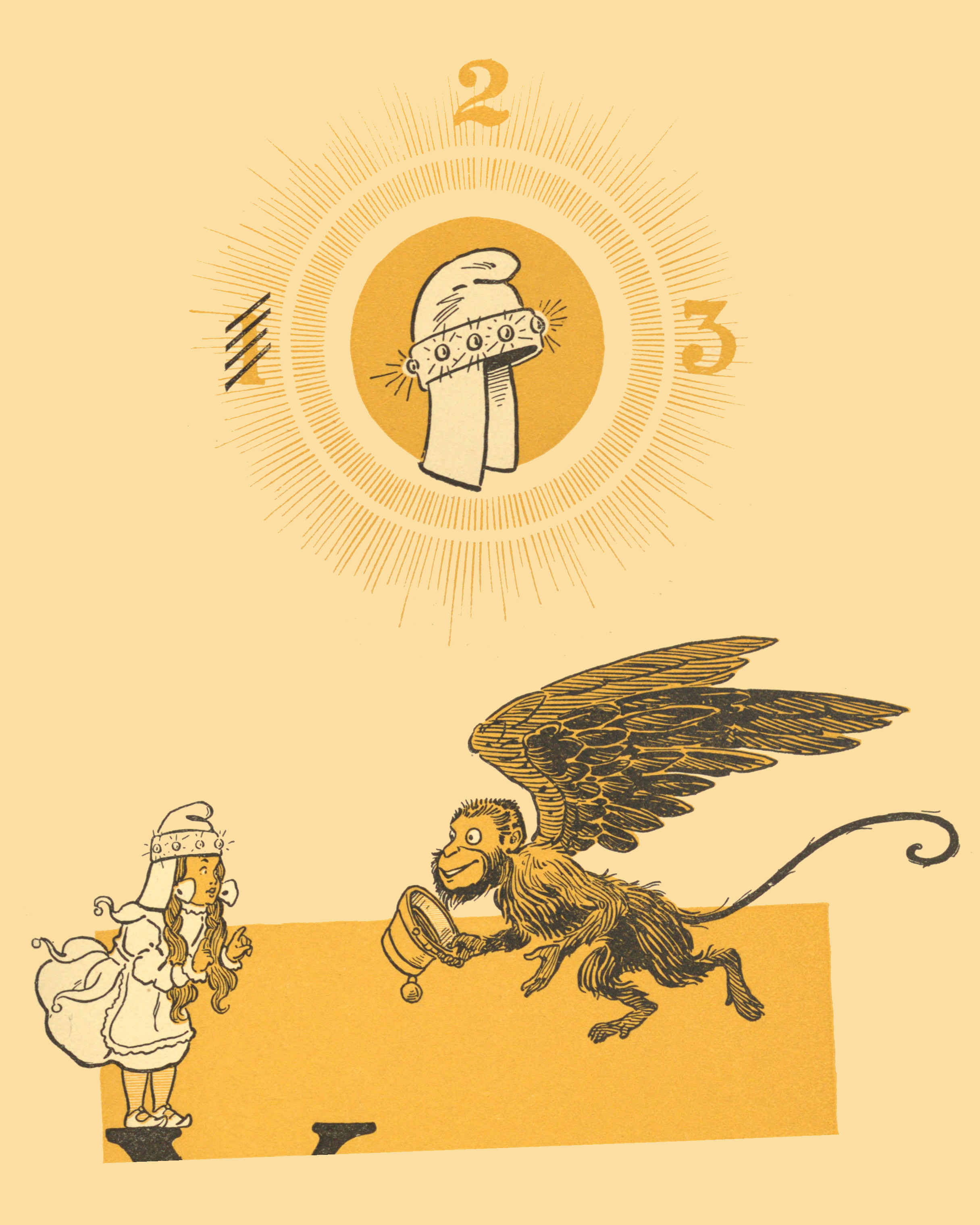 Two W.W. Desnlow illustrations from the original The Wonderful Wizard of Oz book. Top: the magic golden cap that allows its wearer to command the Winged Monkeys thrice. Bottom: Dorothy, wearing the golden cap, speaking to the leader of the Winged Monkeys.