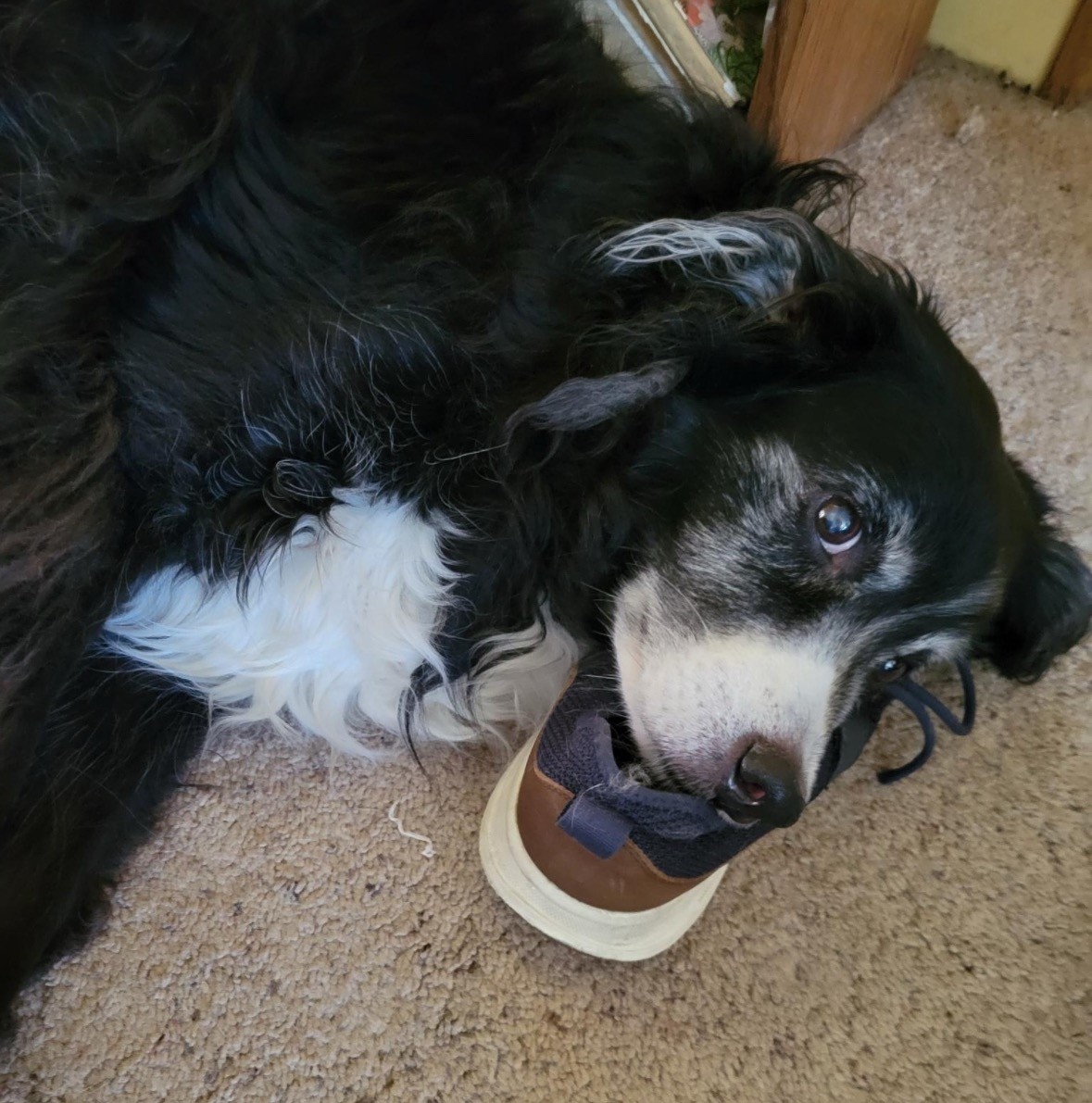 black and white fluffy dog sleeping with his head on a shoe.