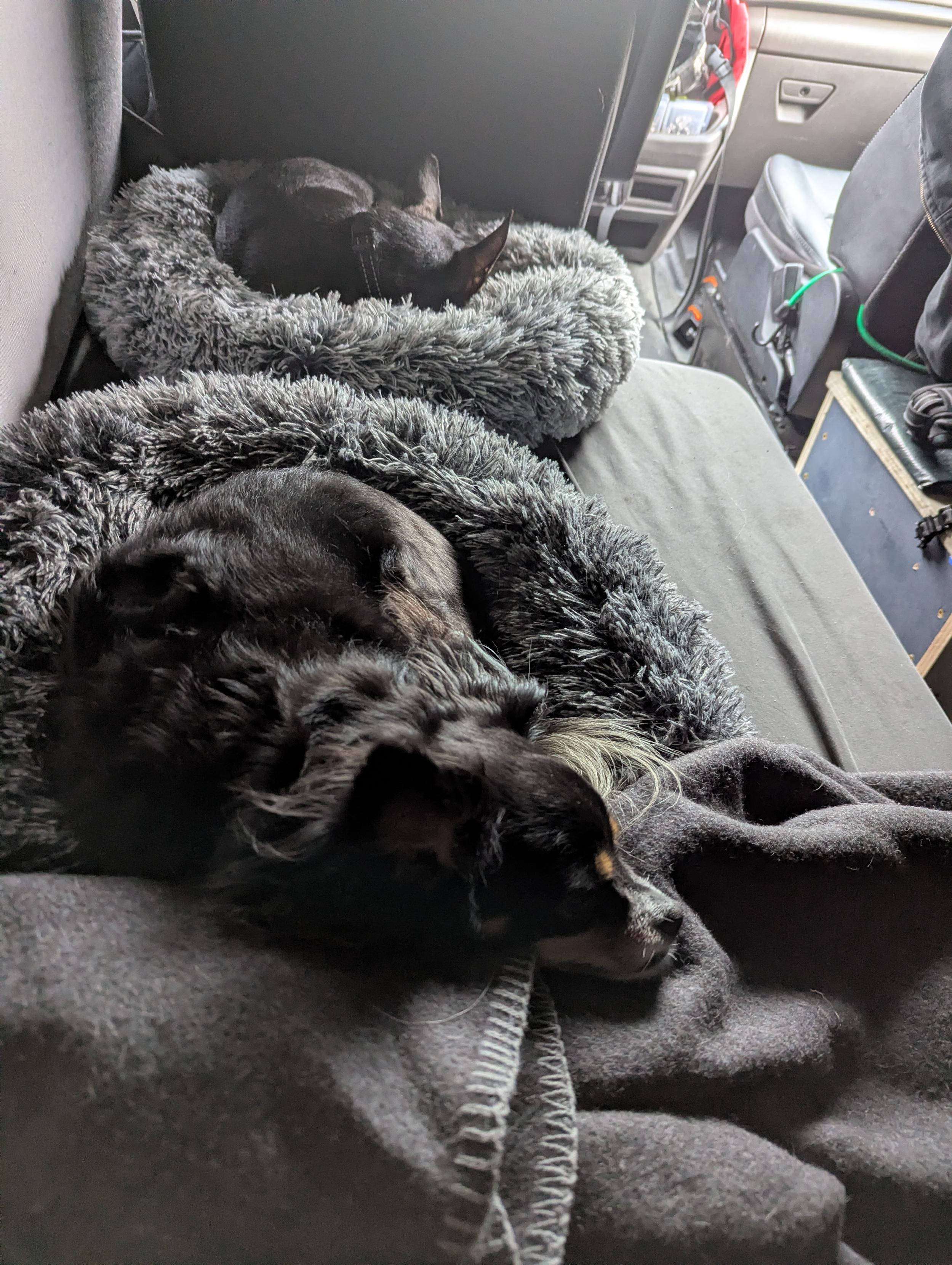 Two small dogs sleeping in fluffy dog beds on a bench in the rear of a camper van.
