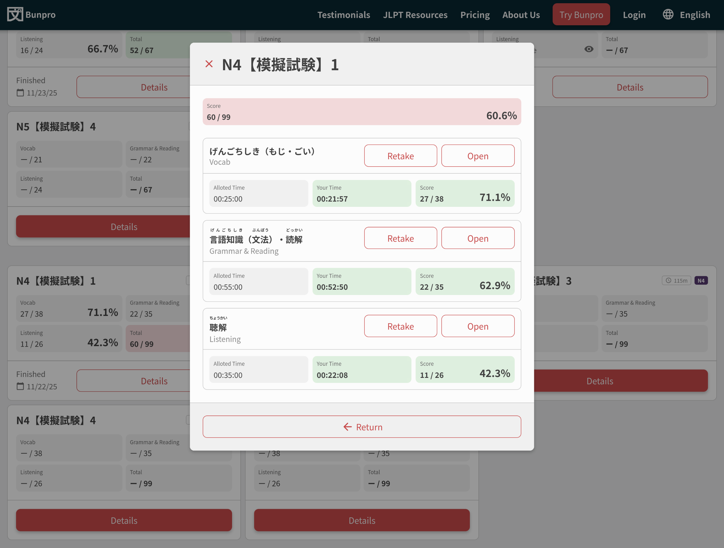 Screenshot of the results page of a mock test.
